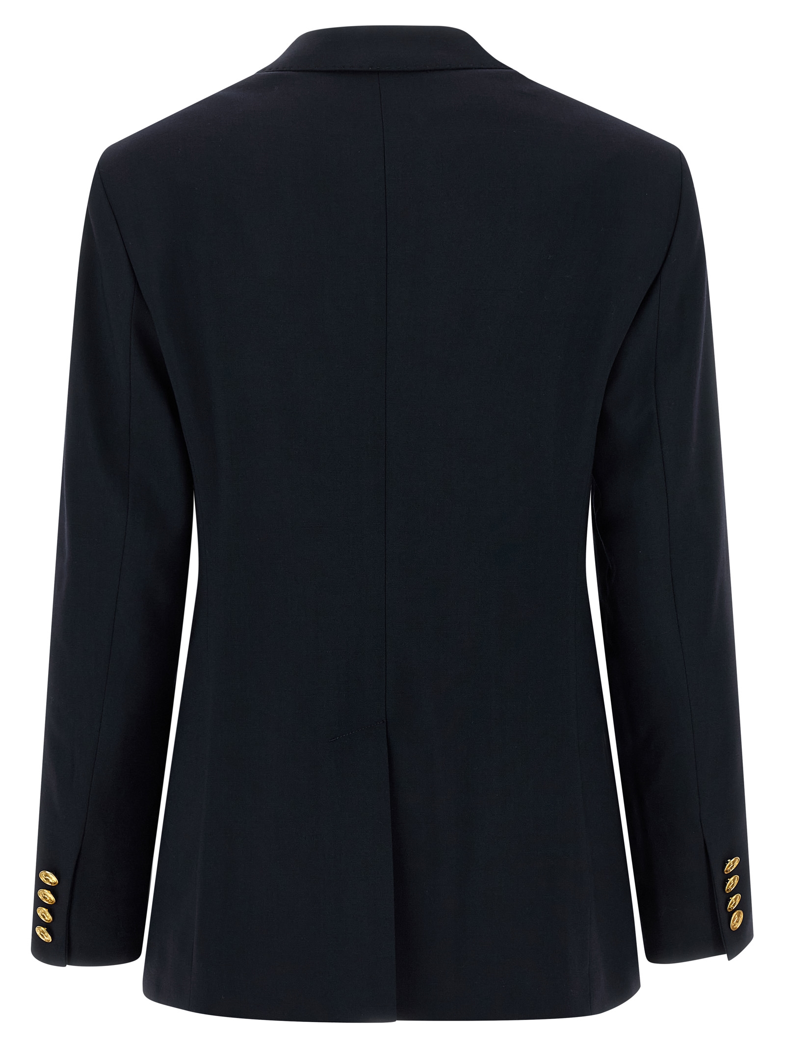 Double-breasted stretch wool crêpe blazer with front button closure, princess stitching, peak lapels, breast pocket, flap pockets, long sleeves, structured shoulder strap, back split, lining.
