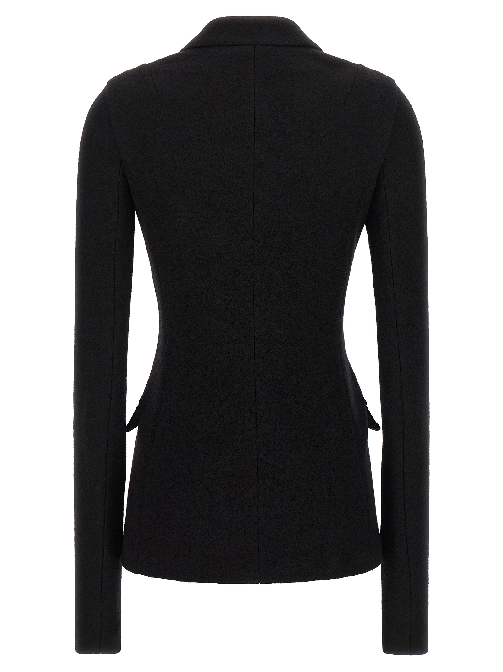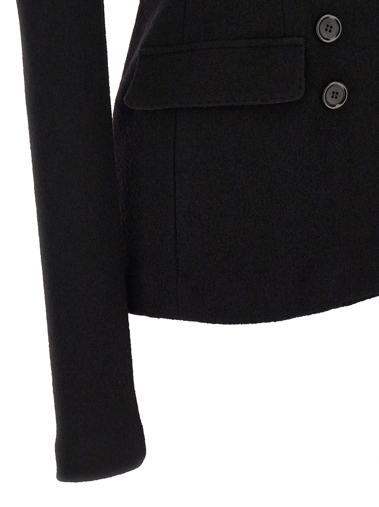 Деконструированный двубортный блейзер из натуральной шерсти с застежкой на пуговицах спереди, силуэтом «песочные часы», пиковыми лацканами, карманами с эффектом trompe l'oeil, длинными рукавами, без подкладки.