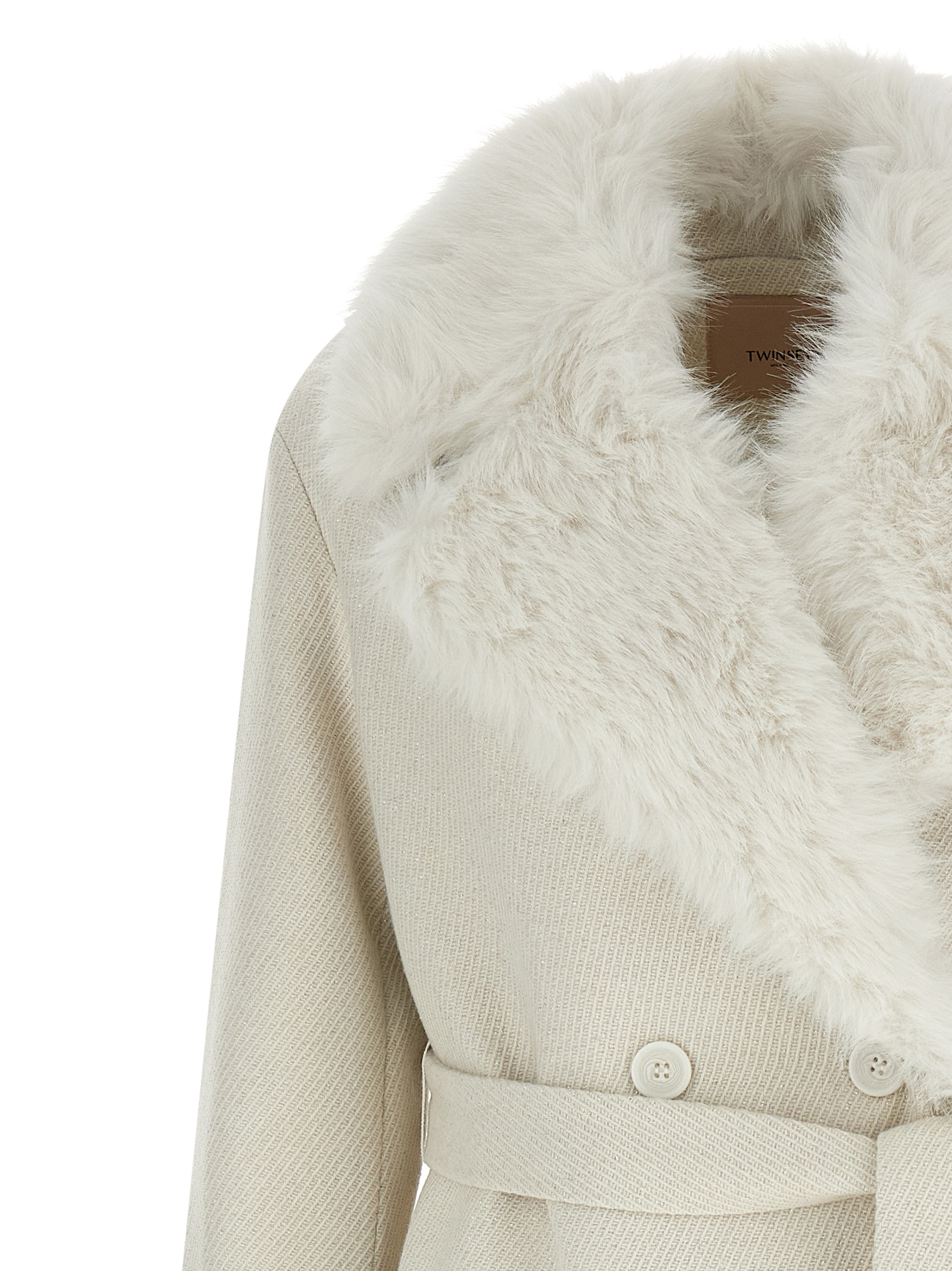 Двубортное пальто из тканого материала с ламе-нитью, застежкой на пуговицах спереди, воротником-лацканом со съемной вставкой из ткани с меховым эффектом, прорезными карманами, длинными рукавами со съемной вставкой из ткани с меховым эффектом, металлической биркой с логотипом и разрезом сзади, стеганой нейлоновой подкладкой и съемным поясом.