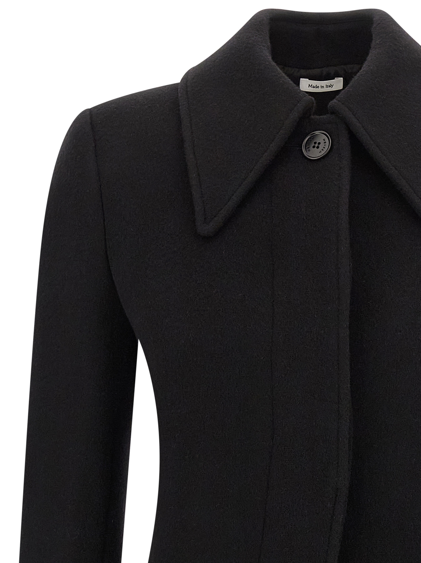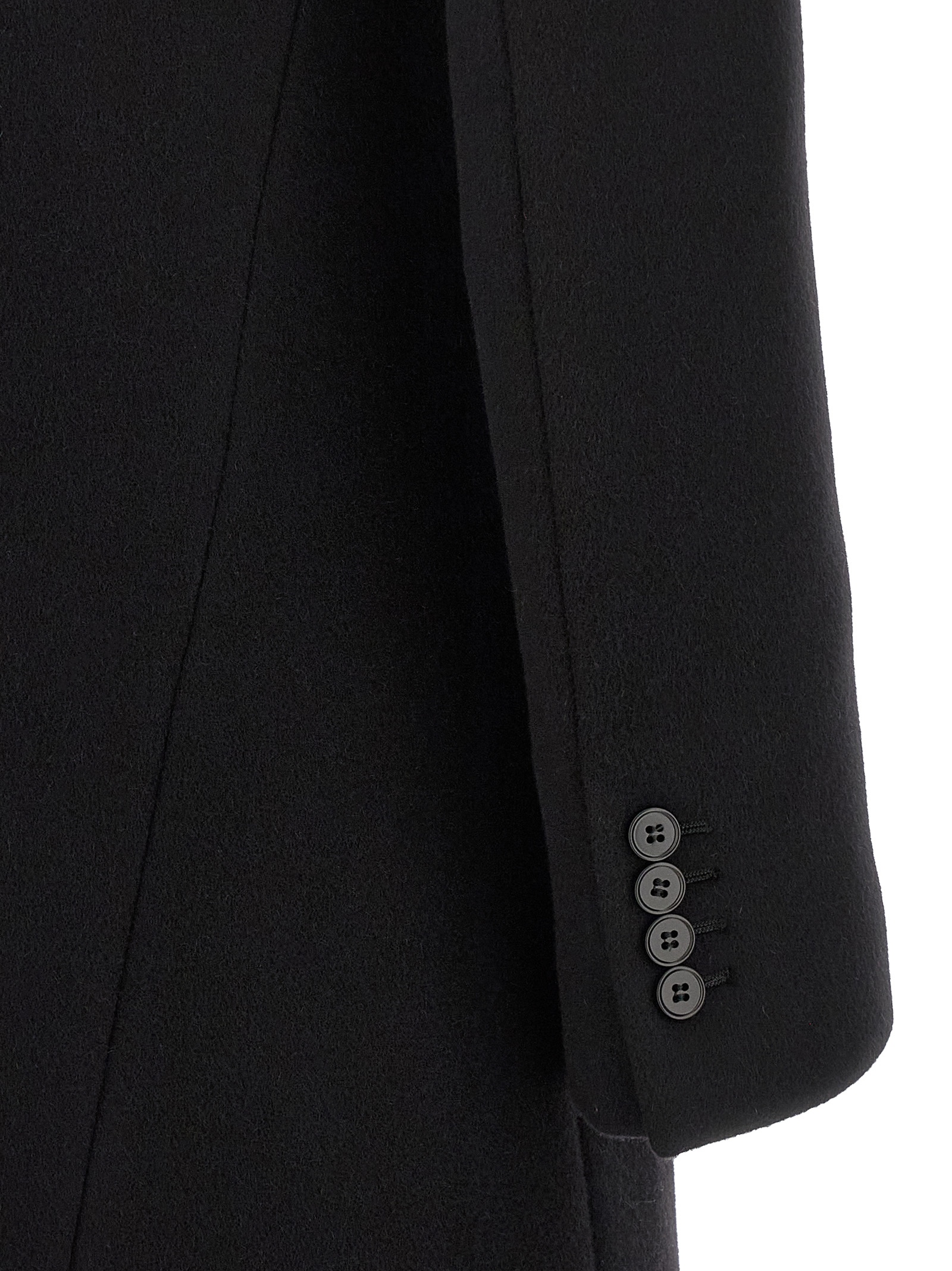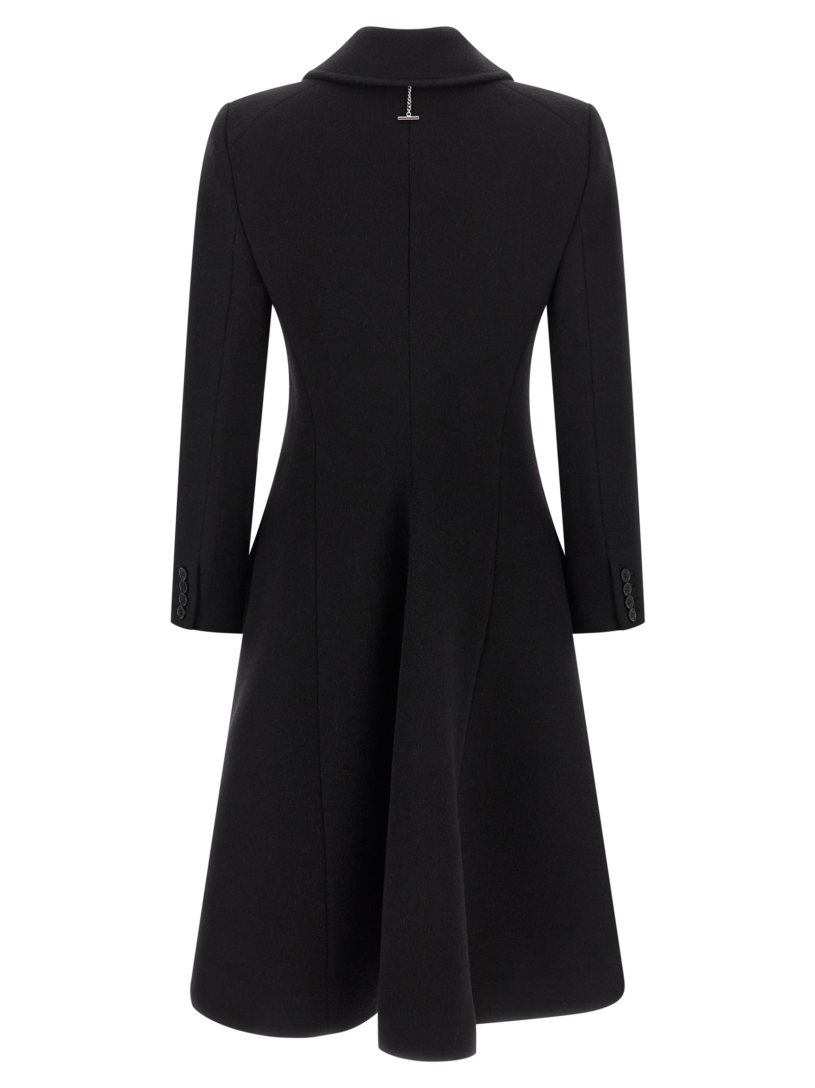 Однобортное пальто из смеси шерсти и кашемира с застежкой на пуговицах спереди, силуэтом «песочные часы», металлическими деталями сзади, воротником-стойкой, прорезными карманами, структурированными плечевыми лямками, длинными рукавами, закругленным подолом и подкладкой.