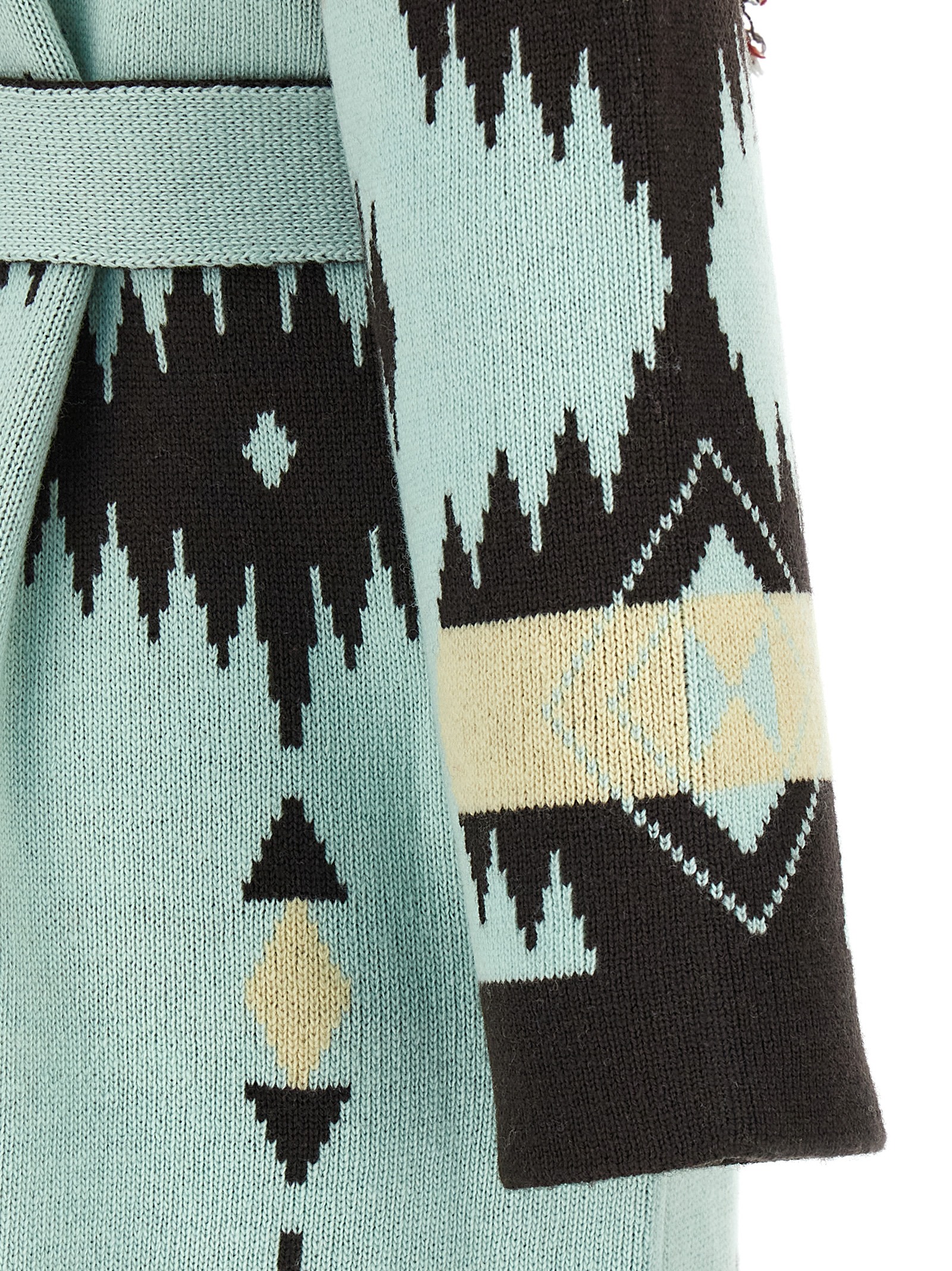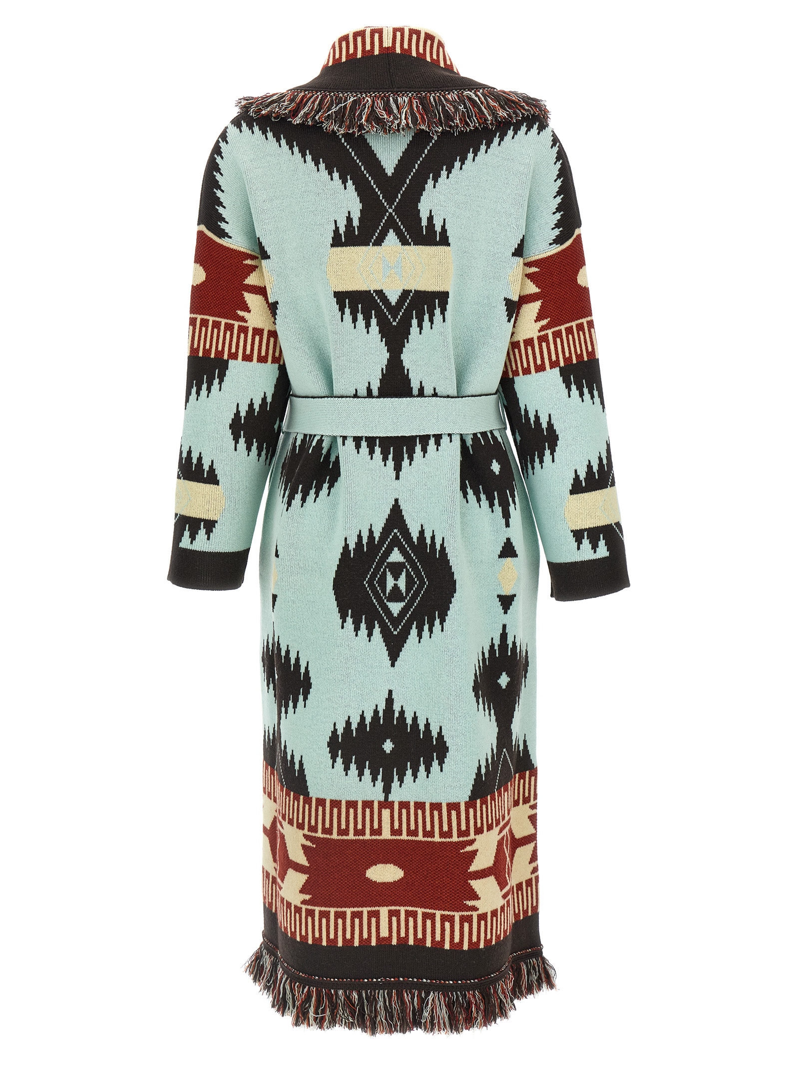 Длинное пальто «Icon» из мериносовой шерсти с двойным жаккардовым узором «Alanui» по всей поверхности, в стиле халата с V-образным вырезом и бахромой по краям, длинными рукавами, карманами и съемным поясом.