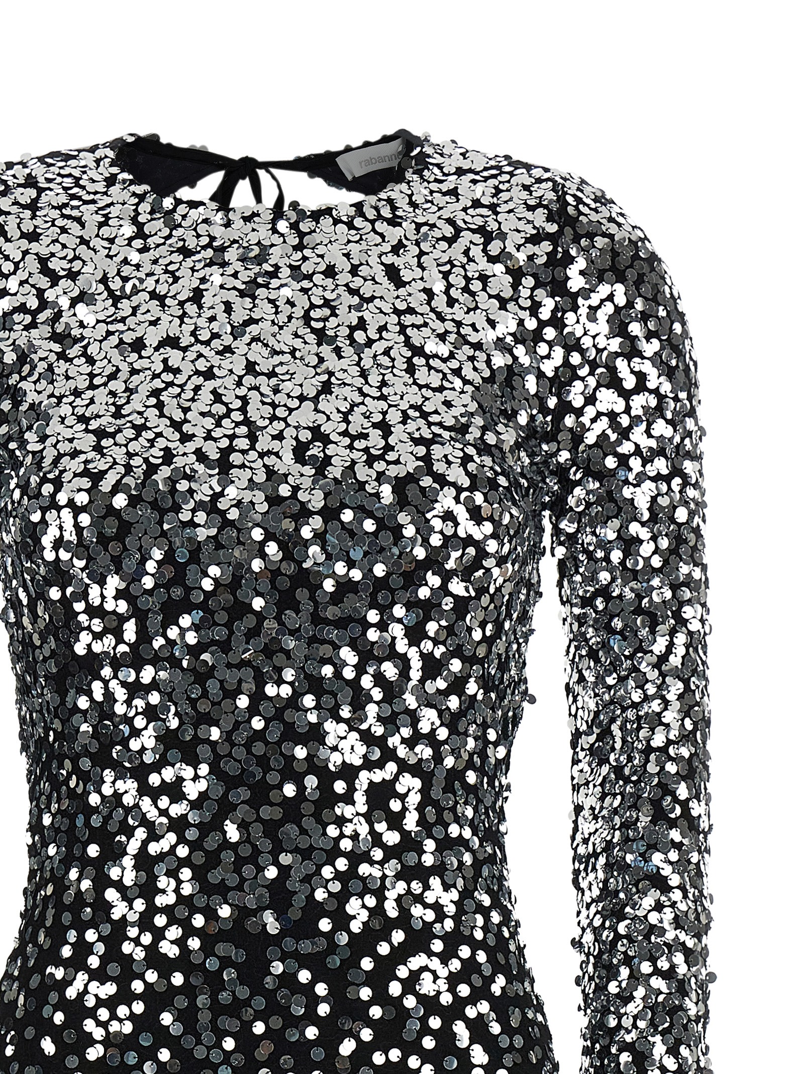 Длинное платье из эластичного джерси, облегающего как вторая кожа, с аппликацией из пайеток по всей поверхности, круглым вырезом с завязкой на шее, длинными рукавами, подкладкой, широким вырезом на спине с открытой спиной.