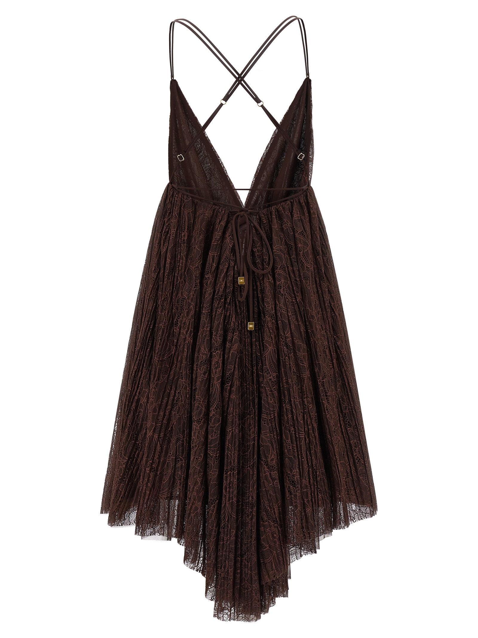 Pleated floral lace mini dress, georgette lining, 'Baby doll' inspired model with front and back neckline, thin crossed and adjustable straps, gold logo metal details, back anodable lace closure.