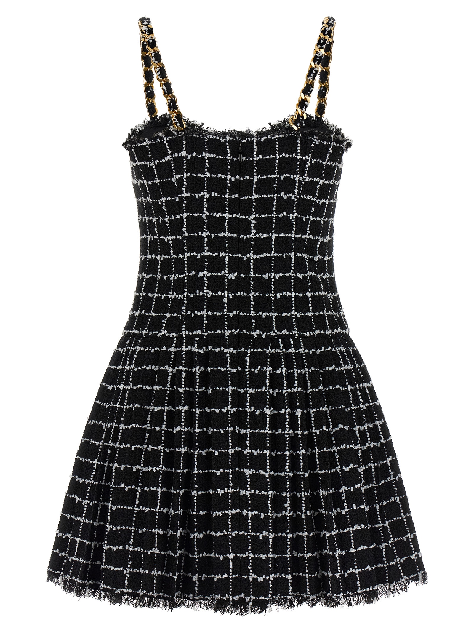 Мини-платье из твида с клетчатым узором, платье-футляр с корсетом, тонкие бретели с цепочками, пуговицы спереди, боковые карманы.