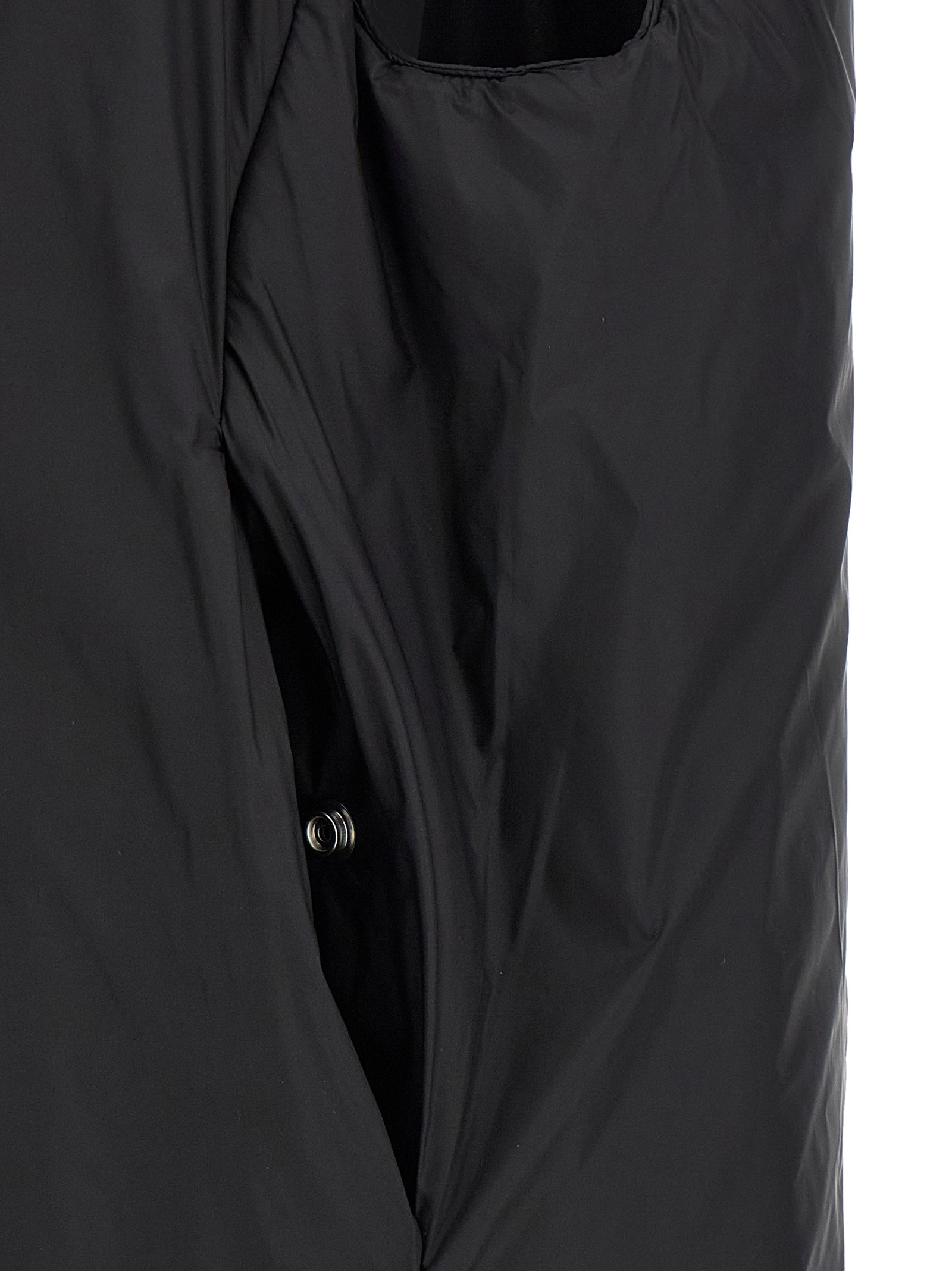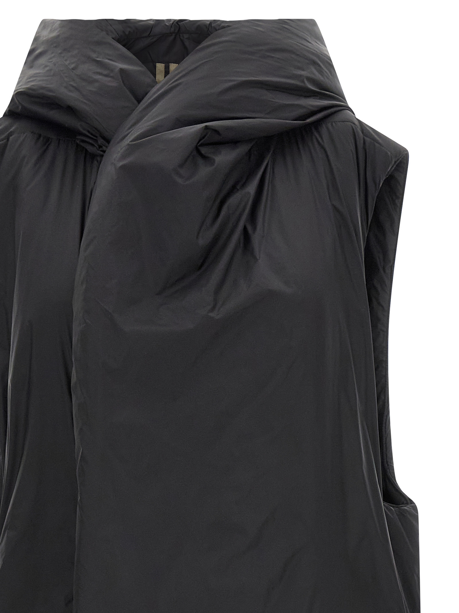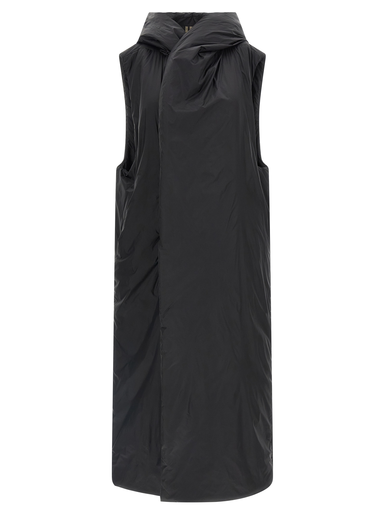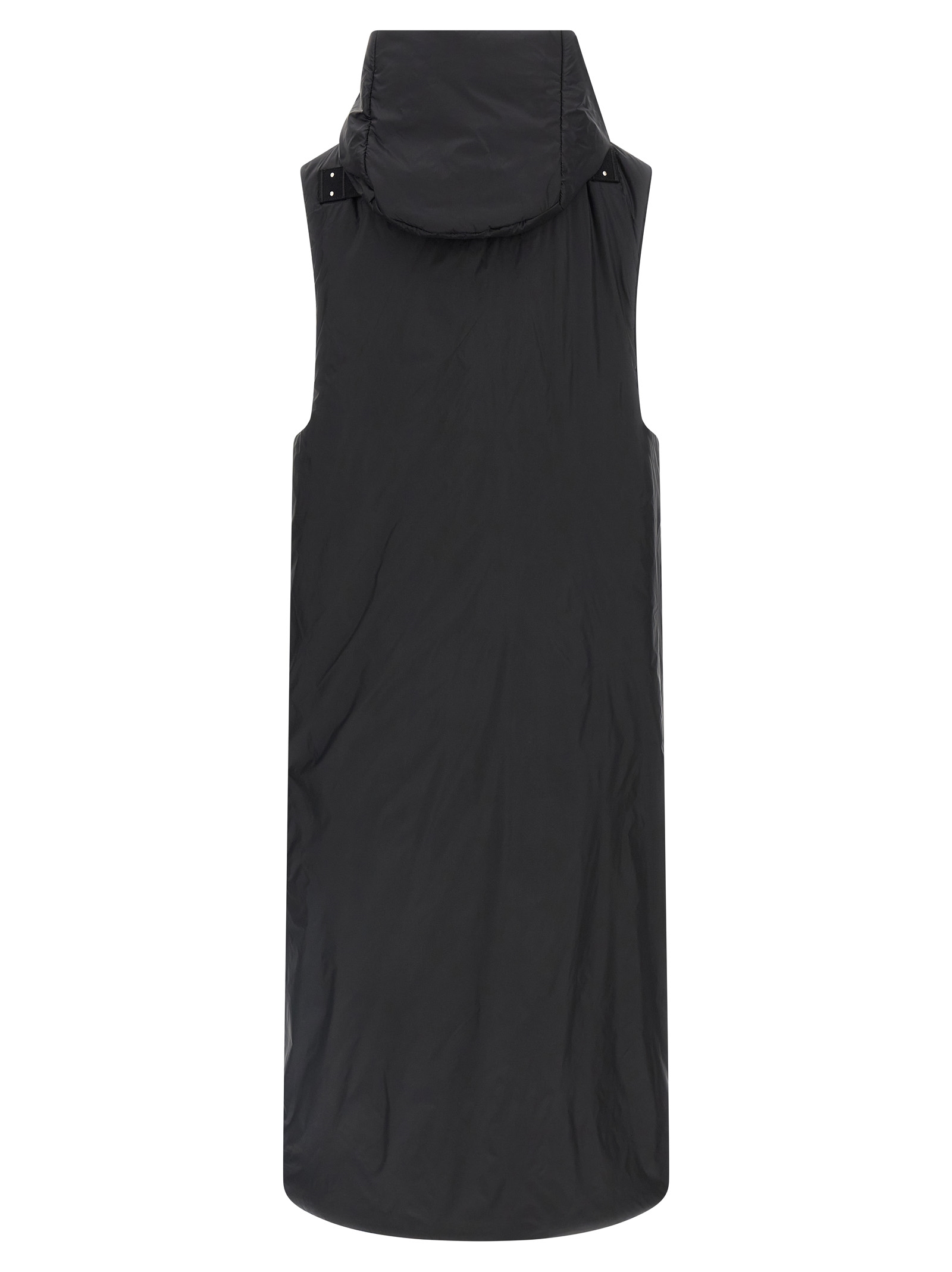 Утепленный нейлоновый длинный жилет, капюшон, высокий воротник, асимметричная застежка на кнопках спереди, карманы, хлопковая тесьма в тон с заклепками сзади. ЭКОЛОГИЧНОСТЬ: изделие изготовлено из переработанных материалов.