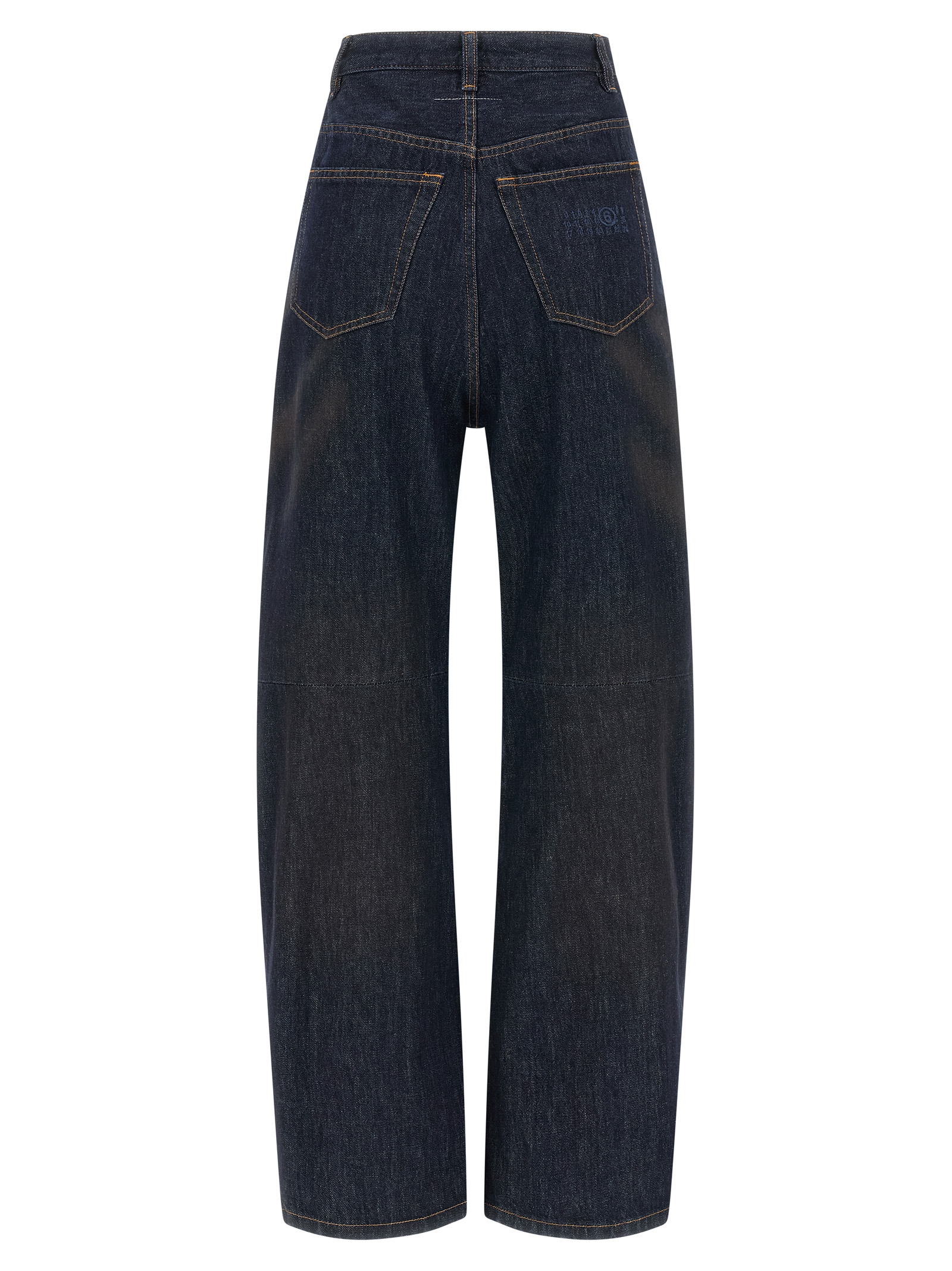 5-pocket jeans in cotton denim with used effect wash, high waist, front zip and button closure, wide and straight leg style with knee pin tucks, contrast stitching.