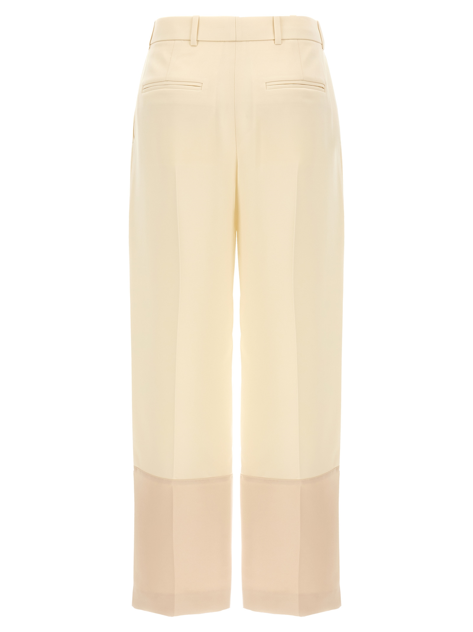 Легкие и устойчивые к заломам брюки из крепа, укороченная модель, средняя посадка, растянутая складка, застежка на крючок и кнопку спереди, карманы, широкий и прямой крой, низ брючин с широким кантом из контрастной ткани.