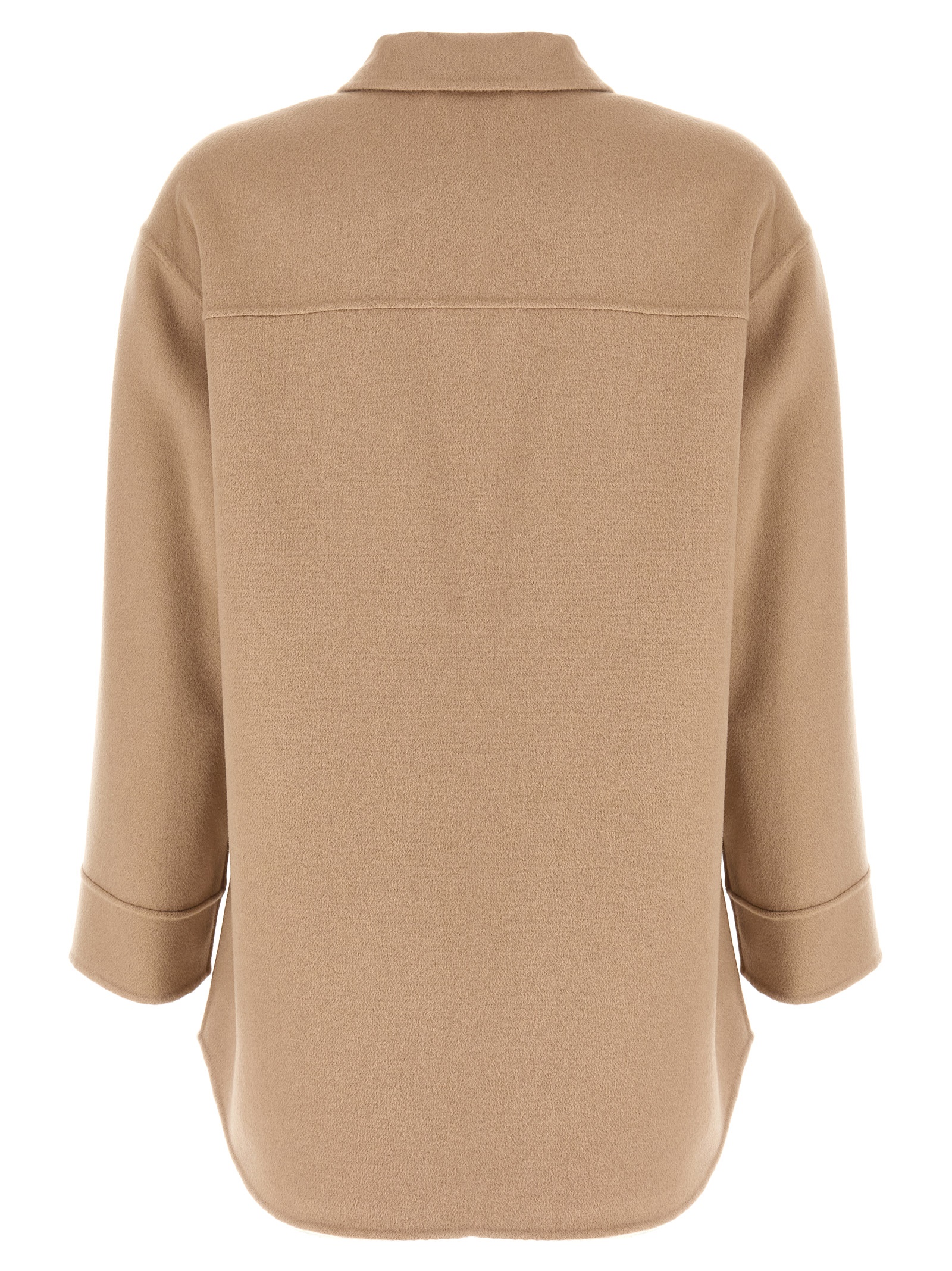 Рубашка «Eleonora» из двойной чистой шерсти, сшитая вручную, с металлической застежкой на передней части, карманами, длинными рукавами и заниженными плечами.
