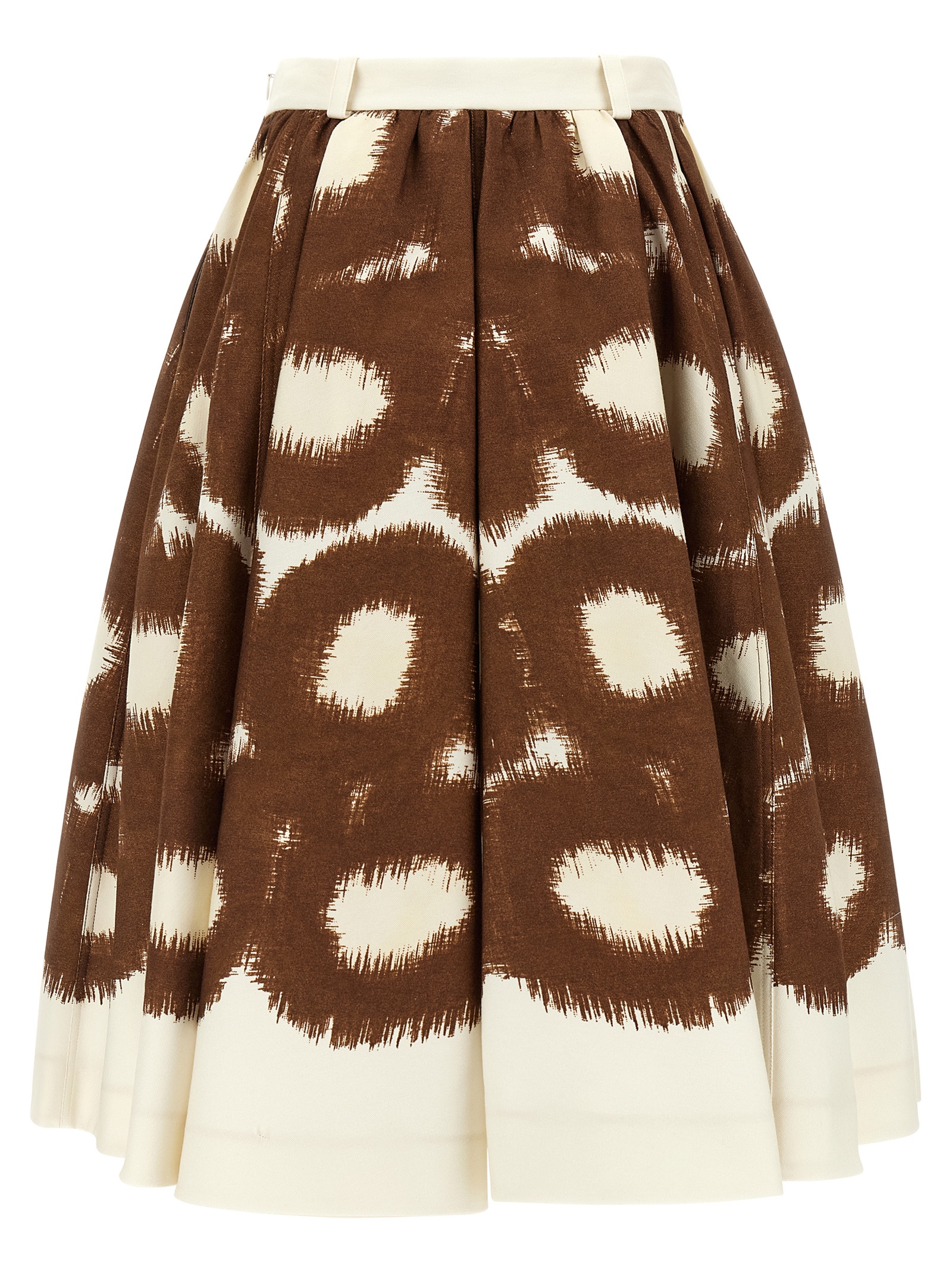 'Circle' print cotton canvas midi skirt, unlined, pleated design, loose fit, belt loops at the waist, side pockets, side zip and hook closure.
