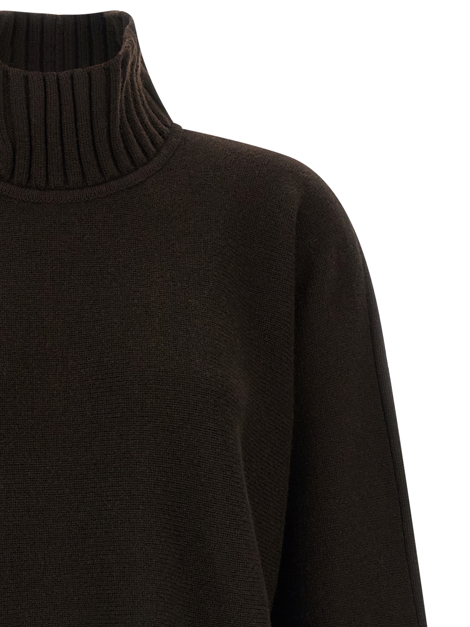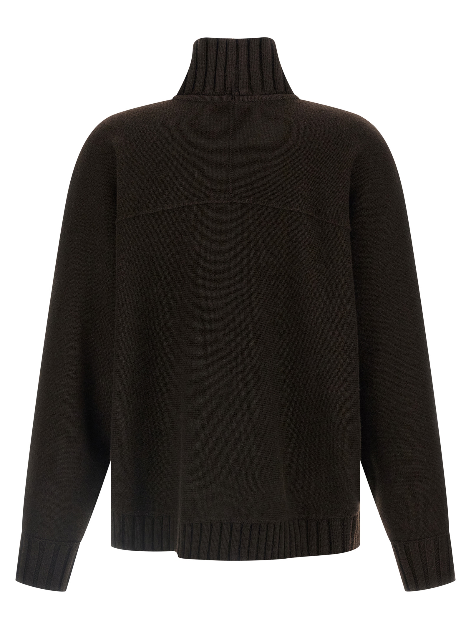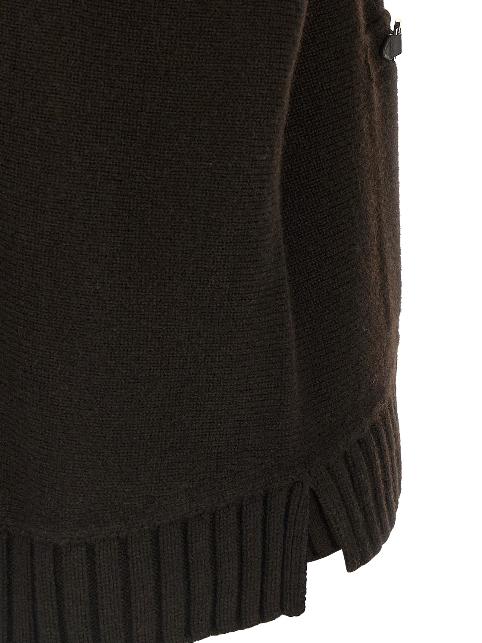Свитер с высоким воротником из смеси шерсти и кашемира, карманы с эффектом «тромп-л'ой» с металлическими и кожаными зажимами, высокий воротник, длинные рукава с манжетами и заниженными плечами, боковые разрезы.