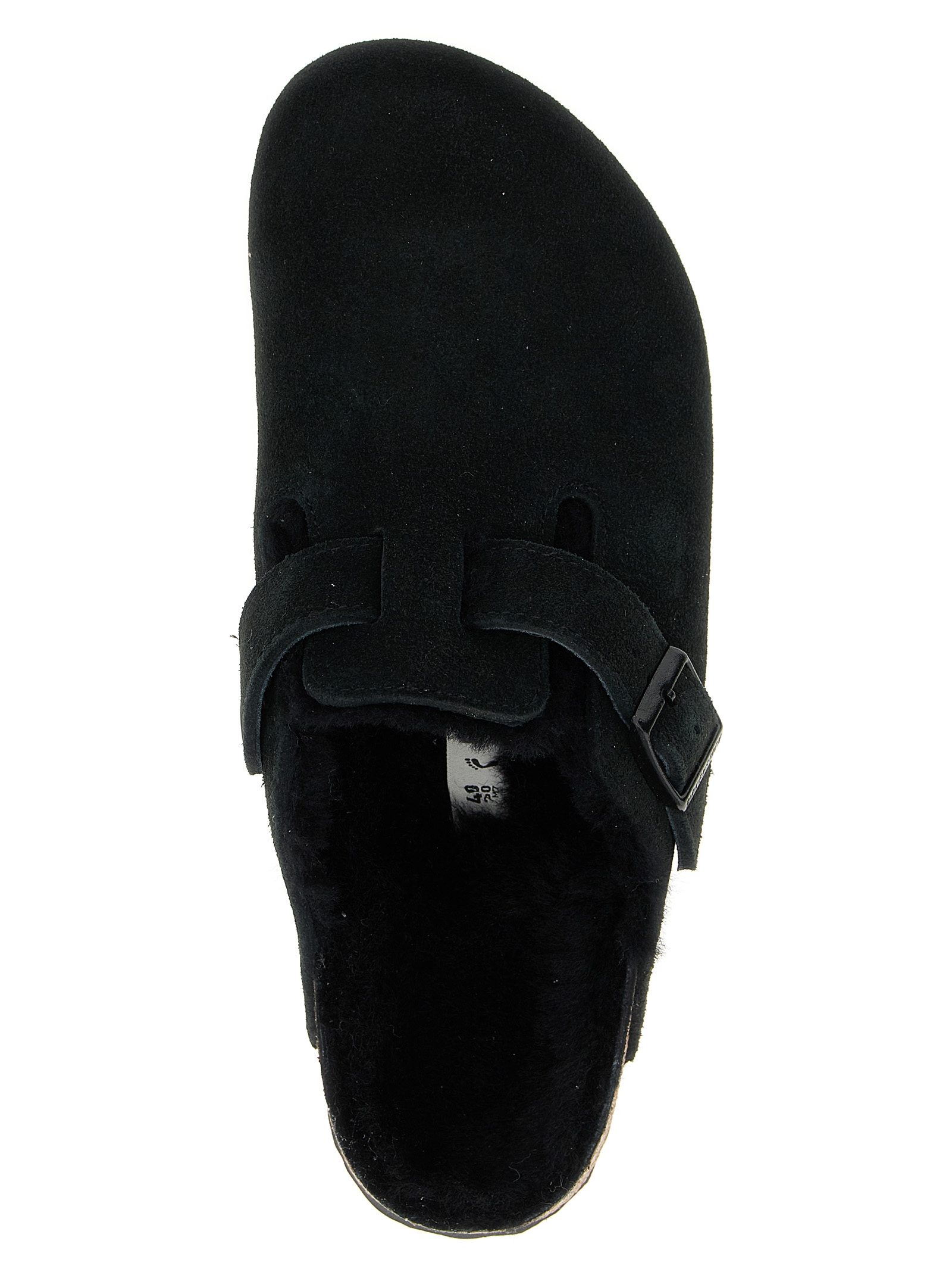 Замшевые ботинки-сабо, подкладка из овчины, ремешок с регулируемой металлической пряжкой, анатомическая стелька из пробки и латекса, подошва из ЭВА.