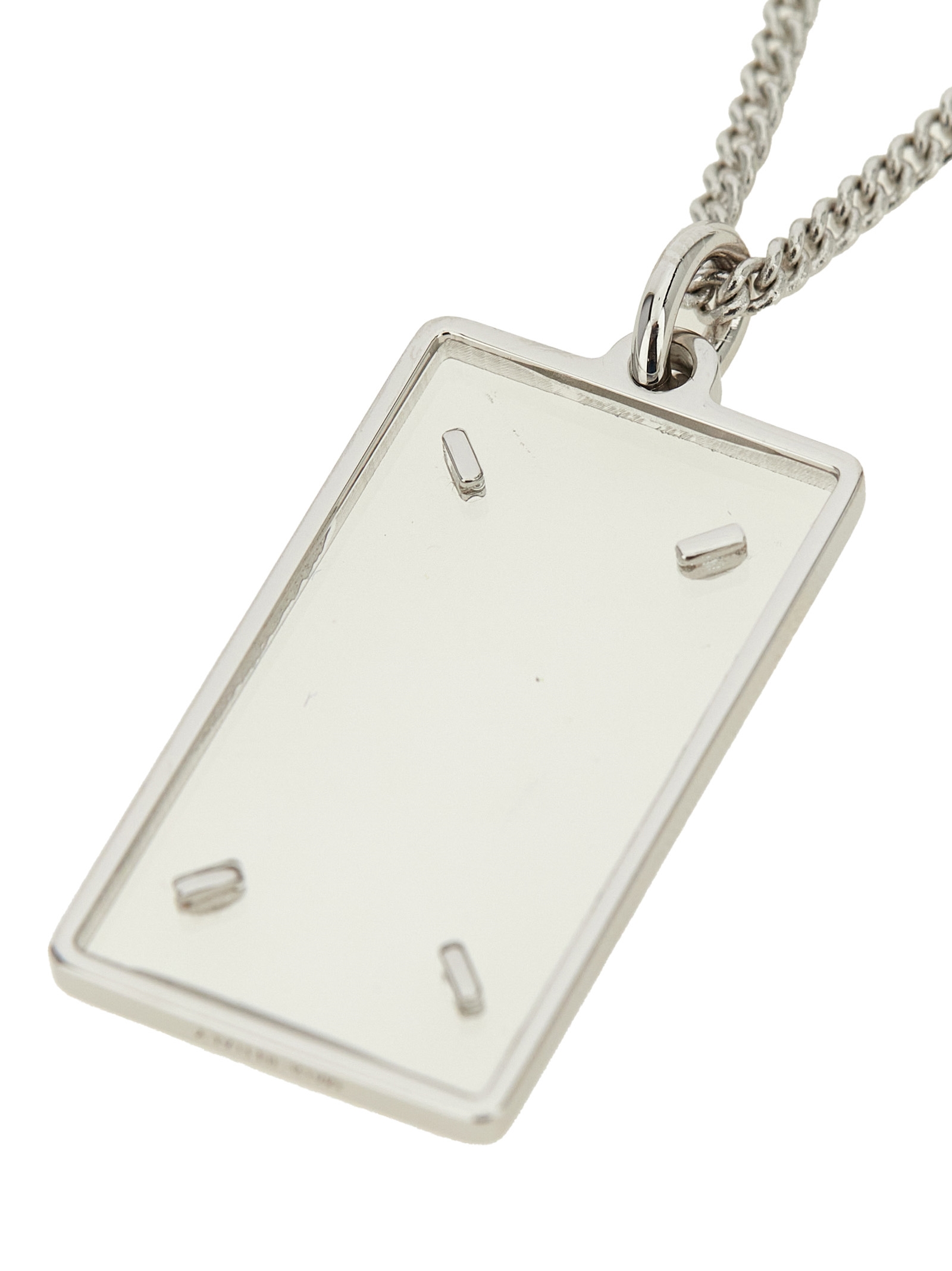 Metal chain necklace with adjustable 'Four Stitches' pendant and carabiner closure.