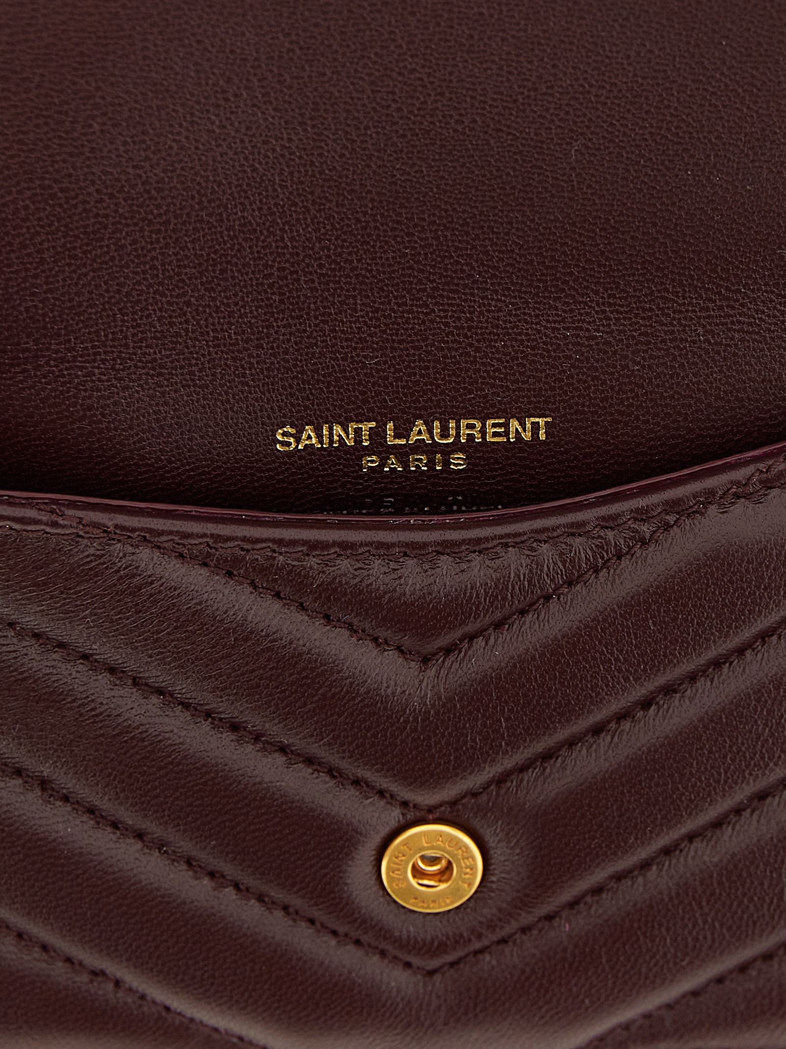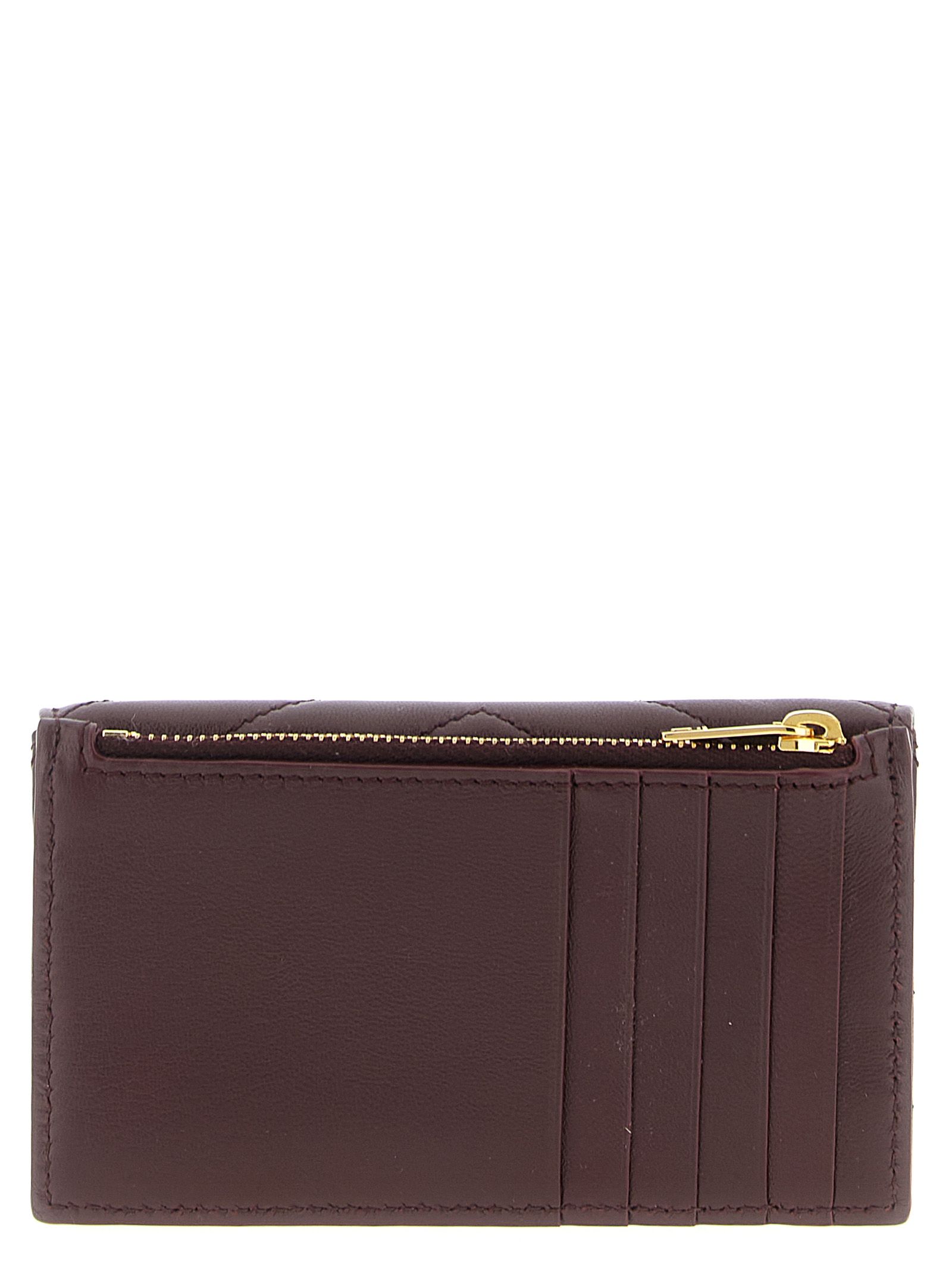 Chevron quilted leather Fragments cardholder, flap closure with snap button and antiqued metal Cassandra logo on the front, back zip pocket, grosgrain lining.