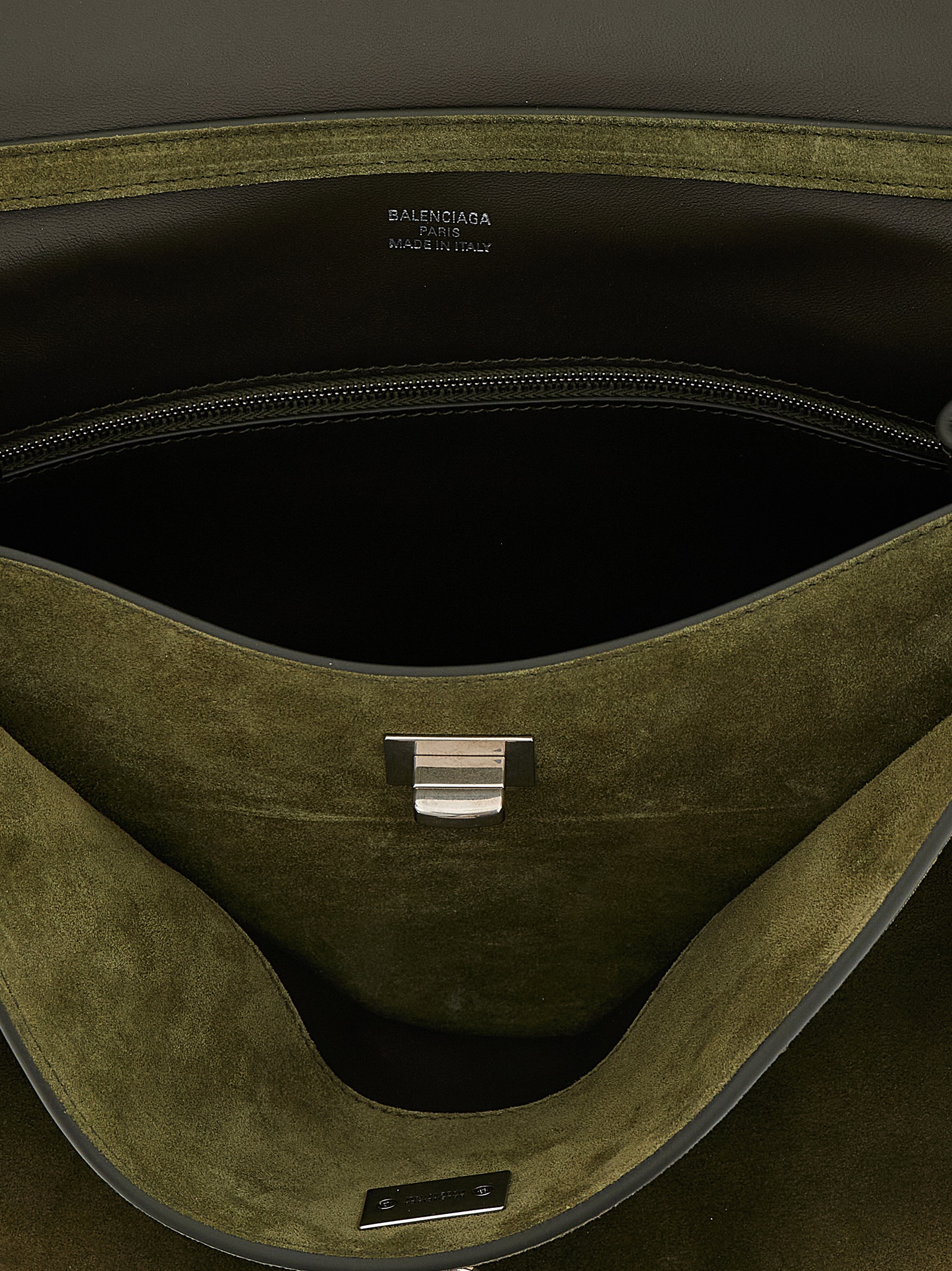 Сумочка «Rodeo» з вощеної замші та гладкої телячої шкіри, застібка-клапан з металевим поворотним кріпленням, бічні вставки з кнопками, передня кишеня, фіксована ручка, жорстка основа з металевими ніжками, підкладка з наппи, знімний ремінь через плече та знімний брелок для ключів.