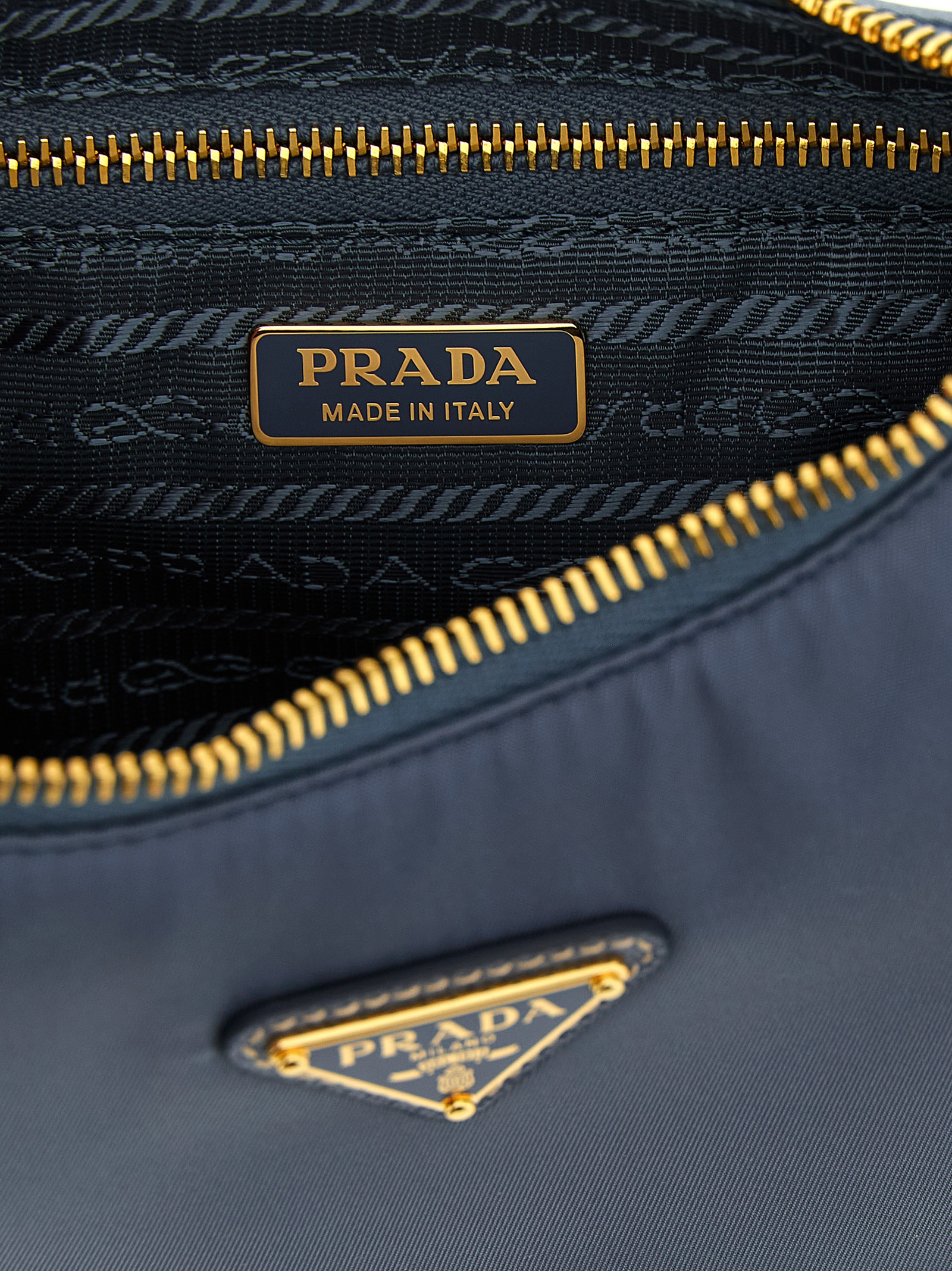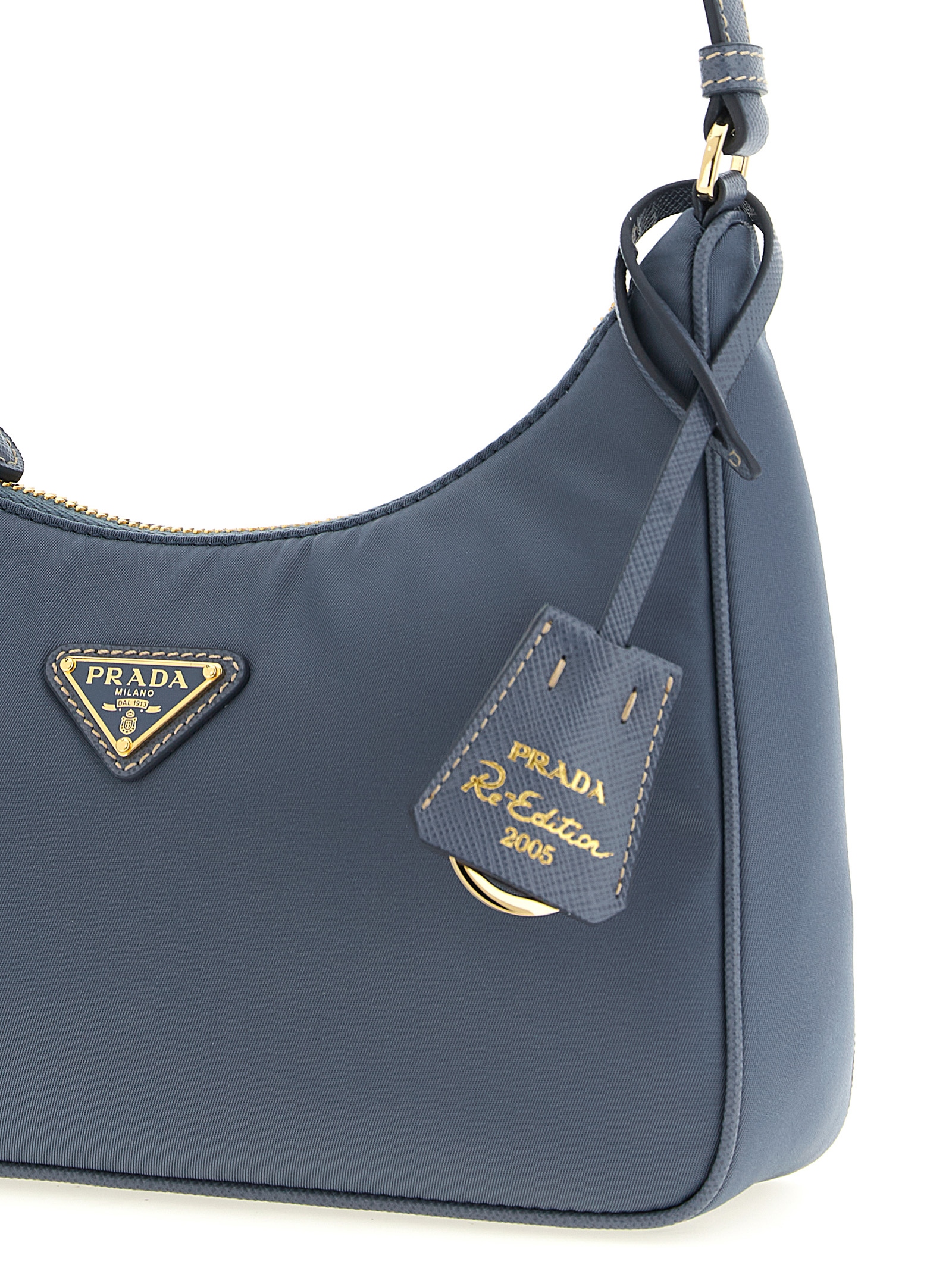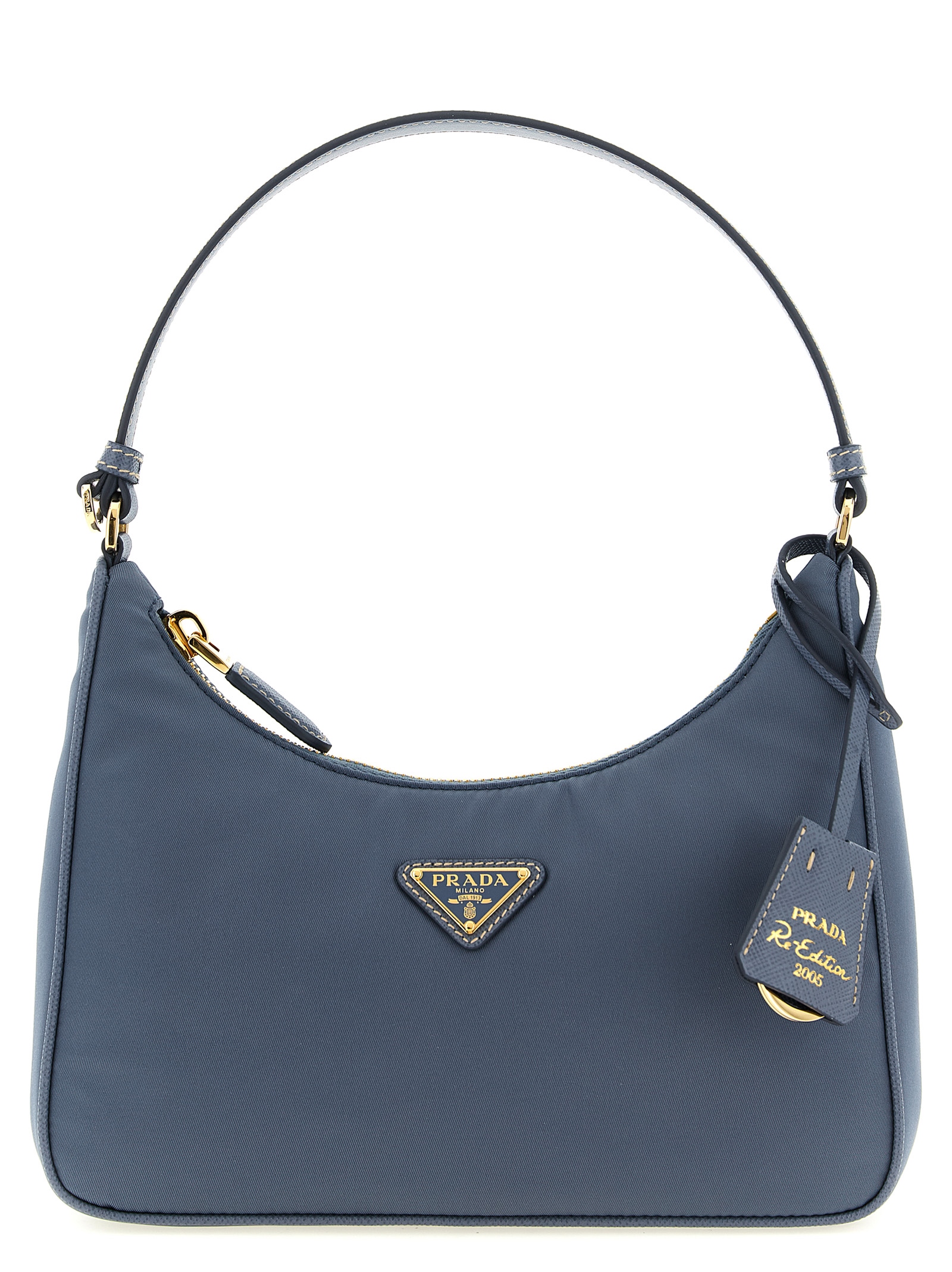 'Prada Re-Edition 2005' shoulder bag in Re-Nylon and Saffiano, front enameled metal triangle logo, top zip closure, fixed handle, removable leather-covered keyring.