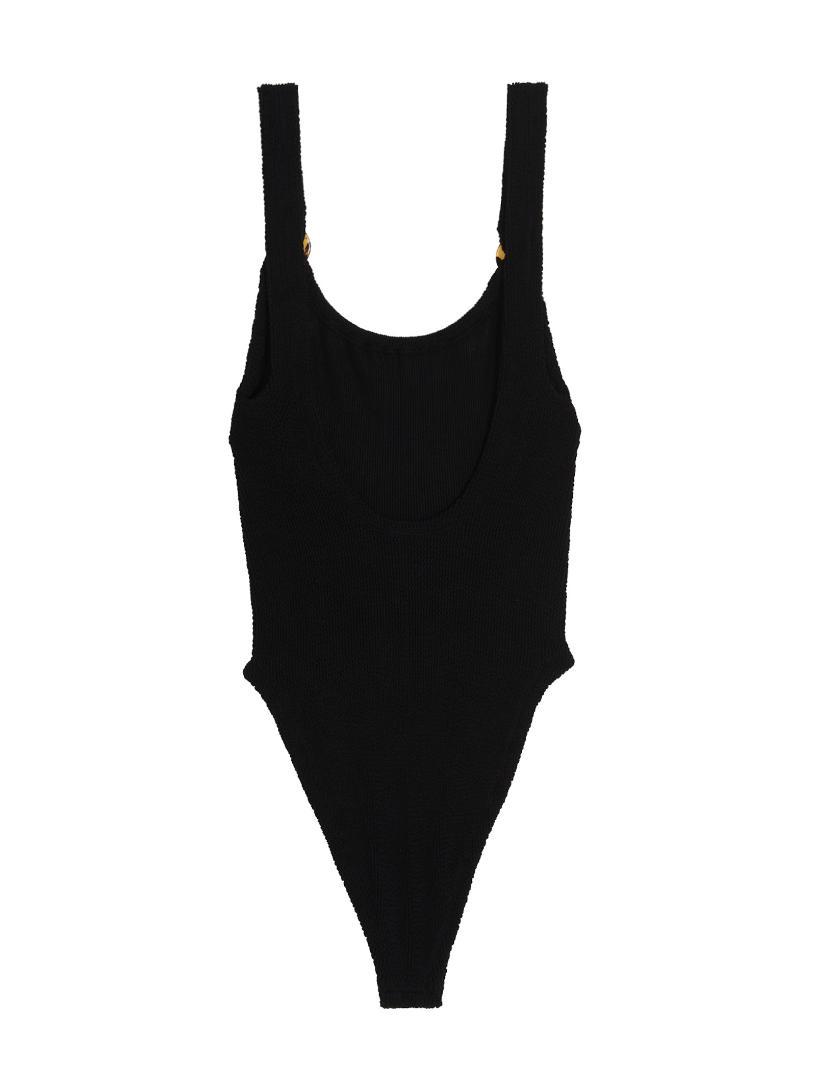 Цілісний купальник Domino, виготовлений з безшовної тканини з ефектом зморшок, з вирізом на спині, вузькими деталями на плечах і високим вирізом на ногах.