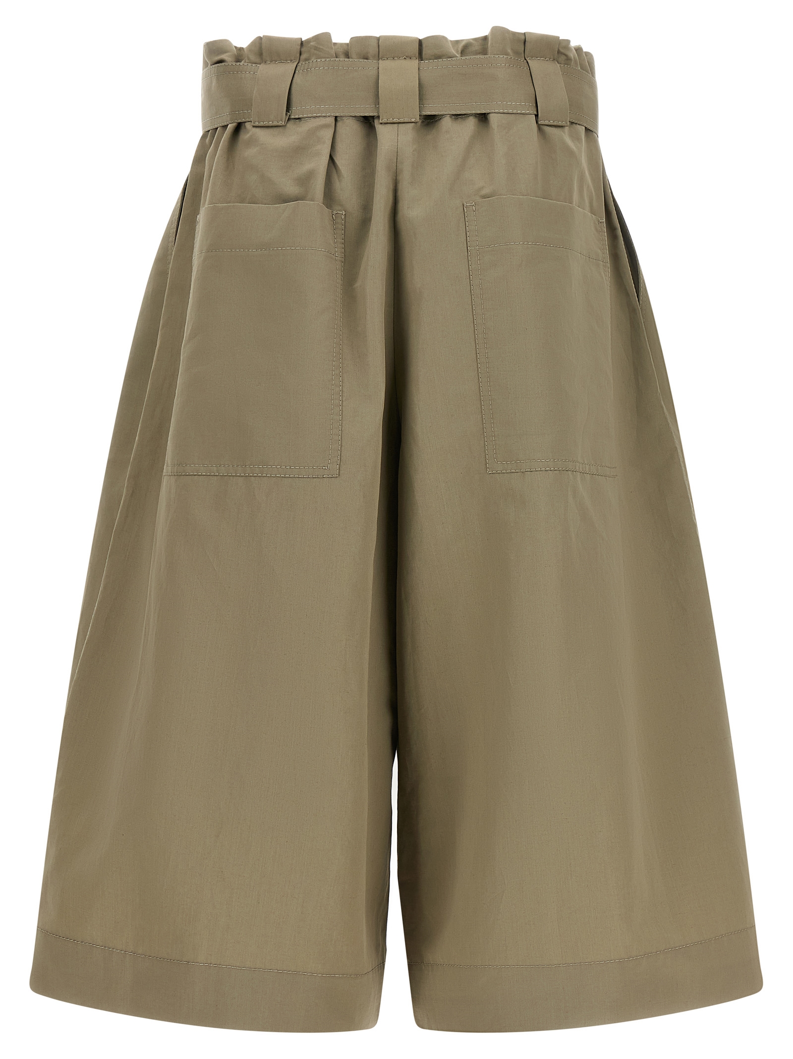 Pull-on cotton and ramie blend bermuda shorts with elastic waistband, pins, high waist with bag construction, extra wide flared leg, front French pockets, back welt pockets, and removable matching belt.