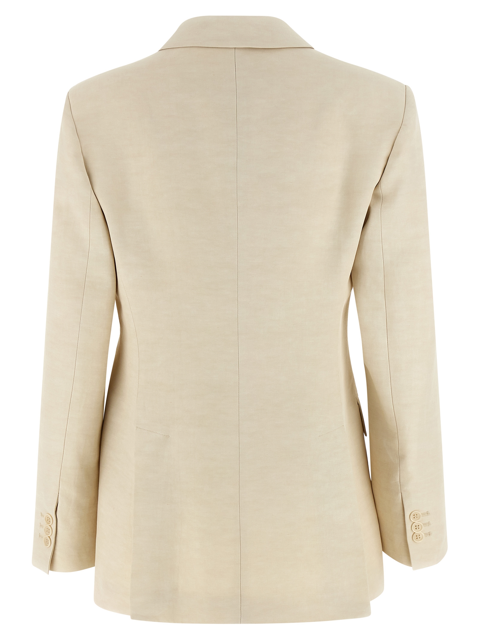 'Raisa' double-breasted linen blend blazer with front button closure, V-neck with lapels, slightly padded shoulders, front pockets, long sleeves with buttons and inner elastic hidden on the wrist.