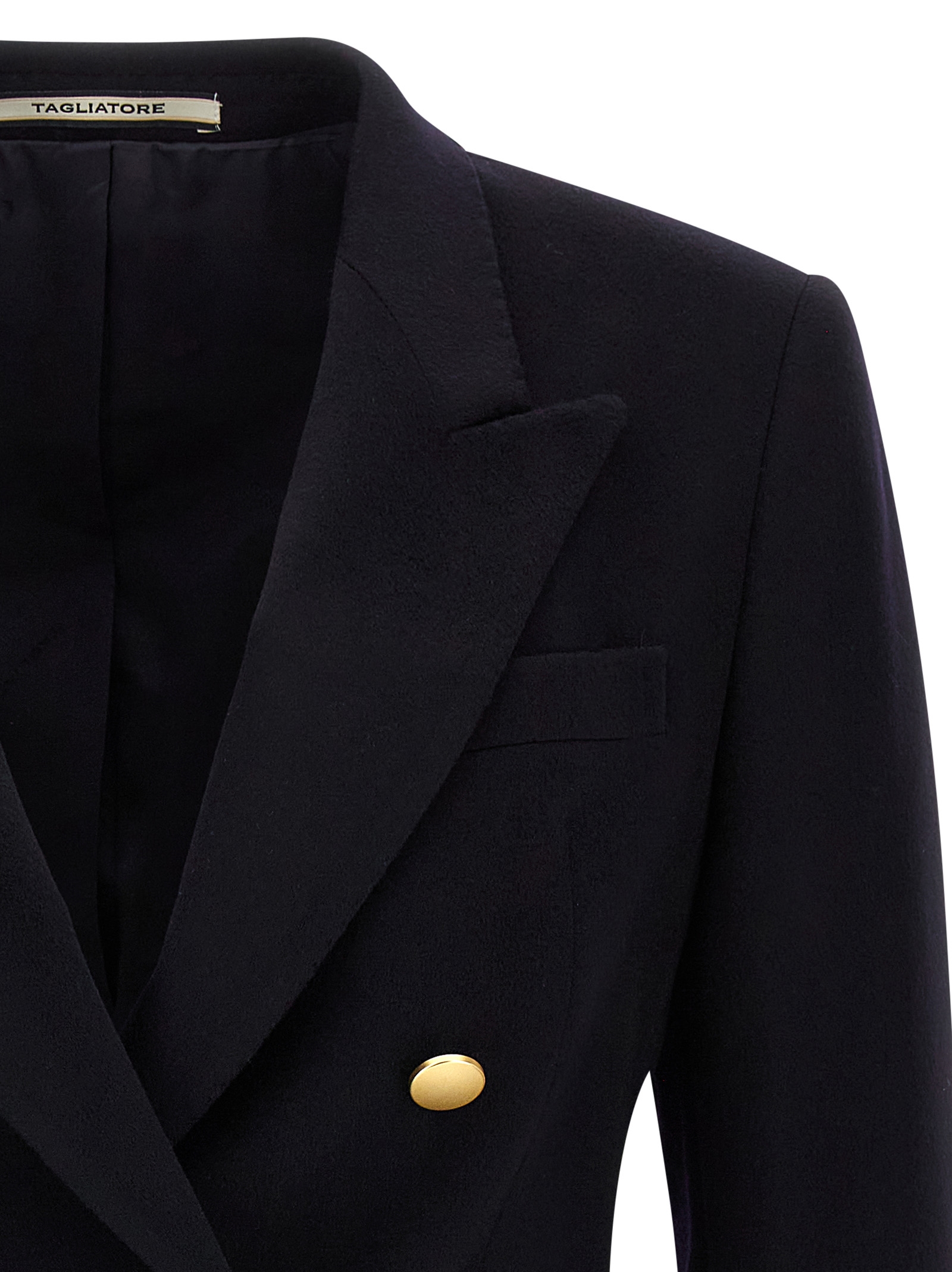 Двобортний кашеміровий блейзер «Parigi» з металевою застібкою спереду, гострими лацканами, нагрудною кишенею, кишенями з клапанами, структурованими плечовими ременями, довгими рукавами, розрізом ззаду, підкладкою з купро з монограмою.
