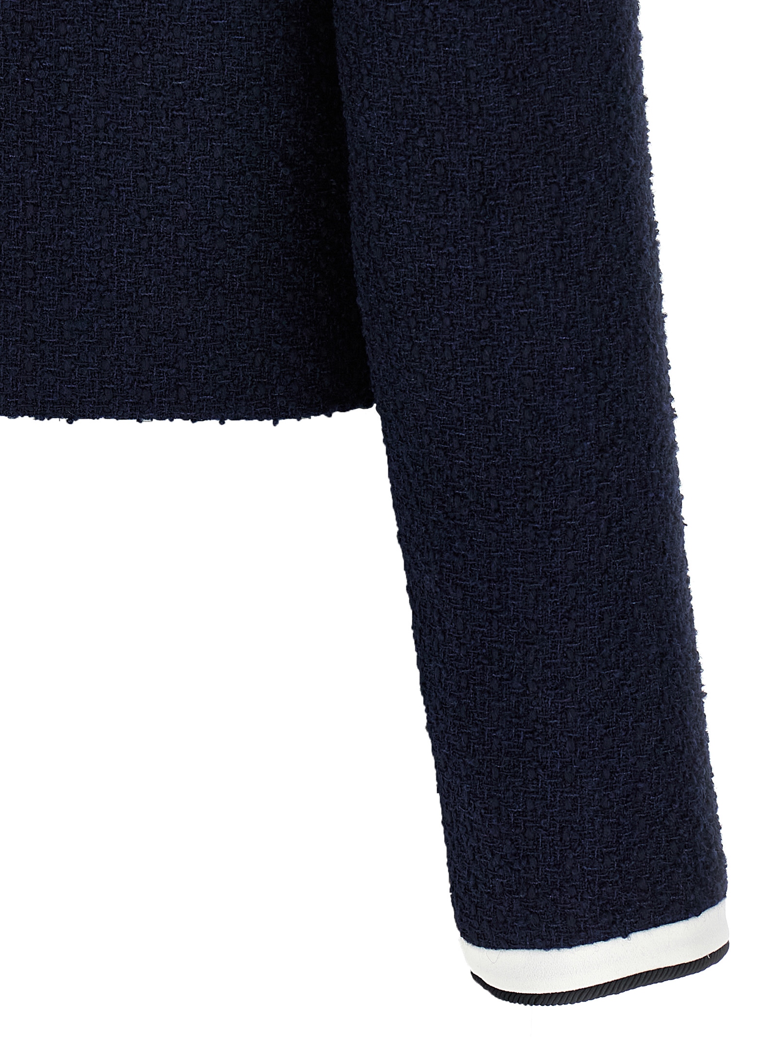Укорочений блейзер з букле 'Navy Boucle Contrast Collar' з контрастним великим матроським коміром, V-подібний виріз, застібка на ґудзиках спереду, кишені, довгі рукави з манжетами, структурований плечовий ремінь, підкладка.
