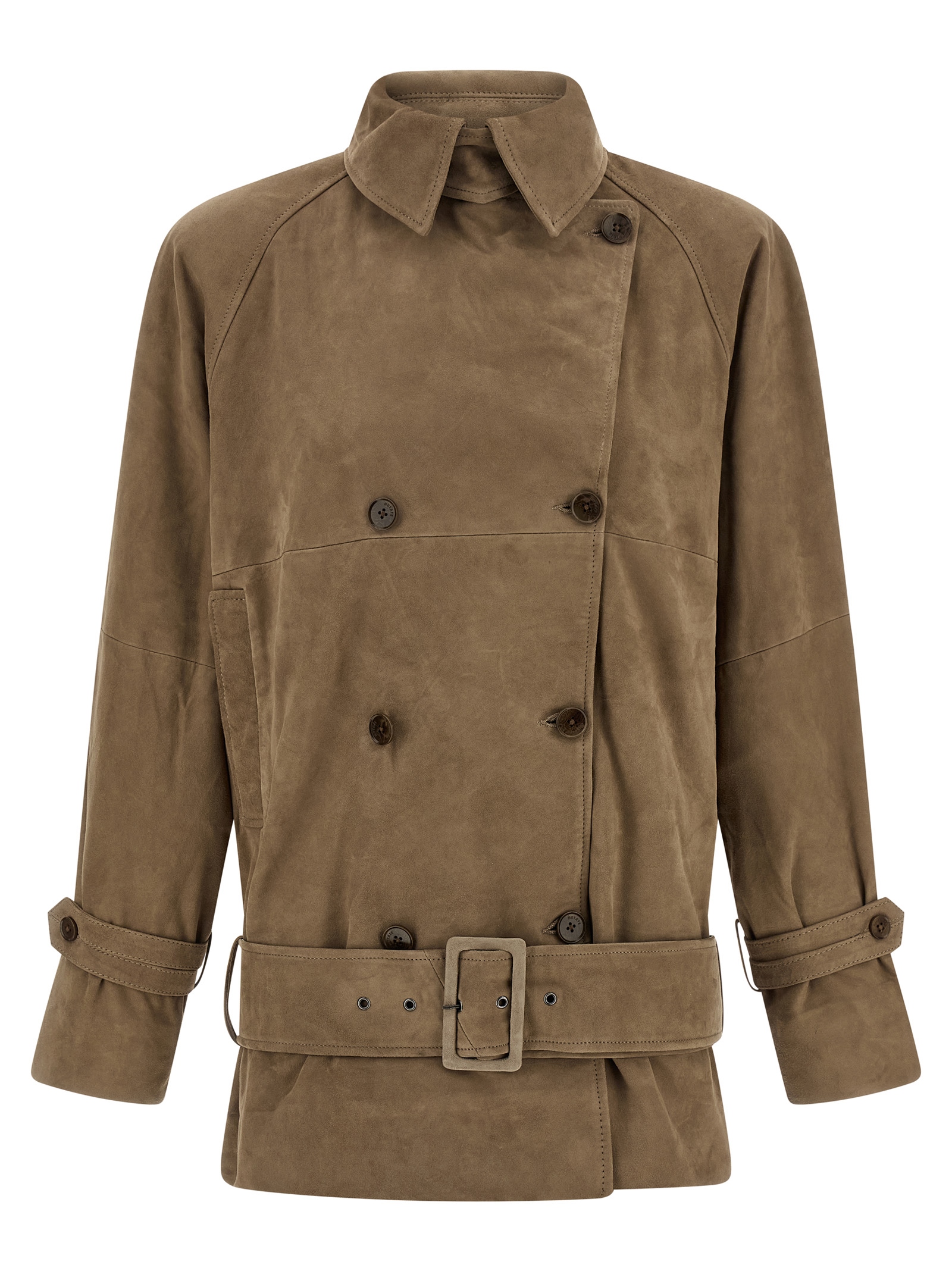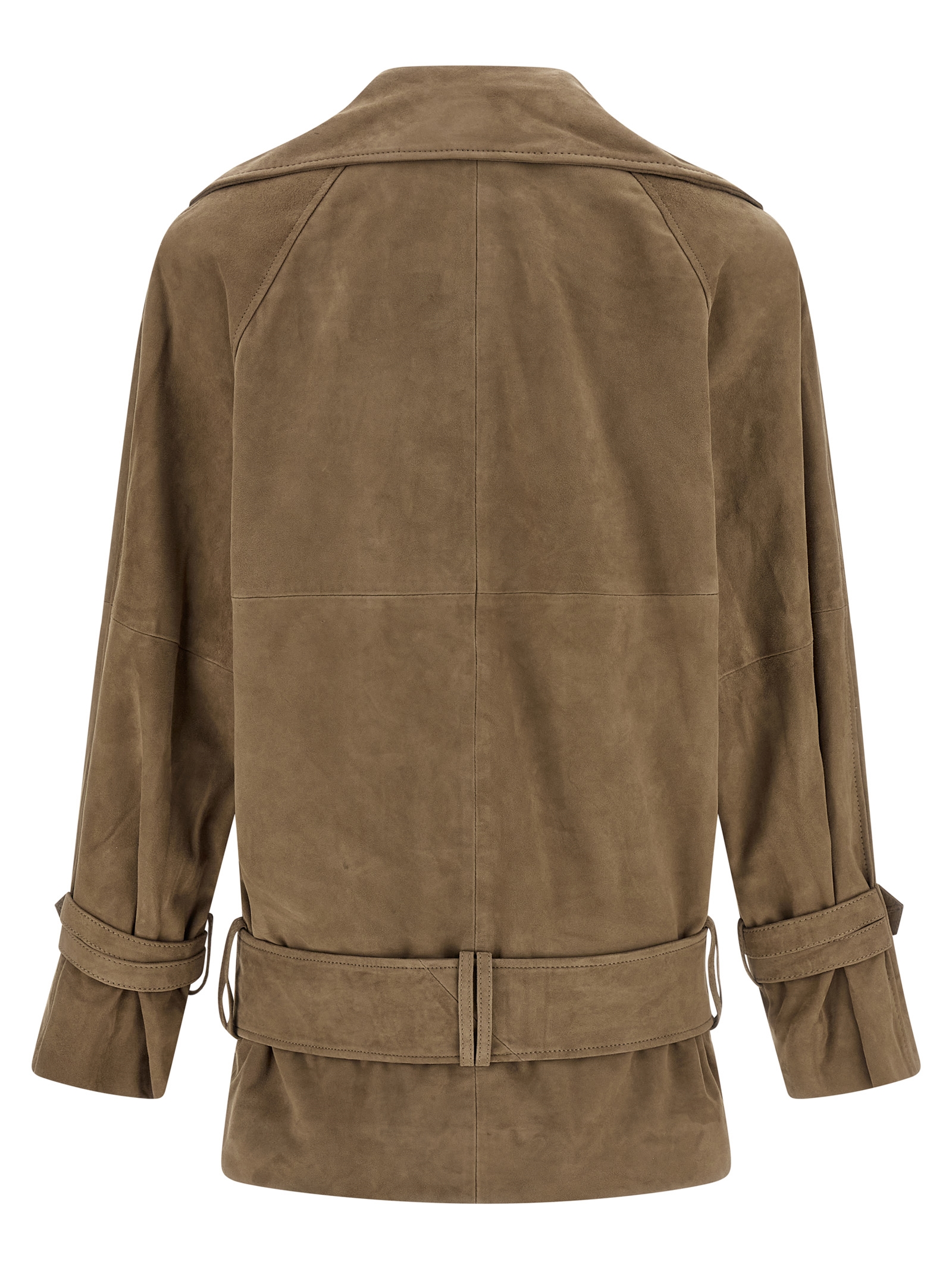 Двобортна замшева куртка з застібкою на ґудзиках спереду, широким коміром з лацканами на ґудзиках, кишенями, довгими рукавами реглан з манжетами, підкладкою та знімним поясом.
