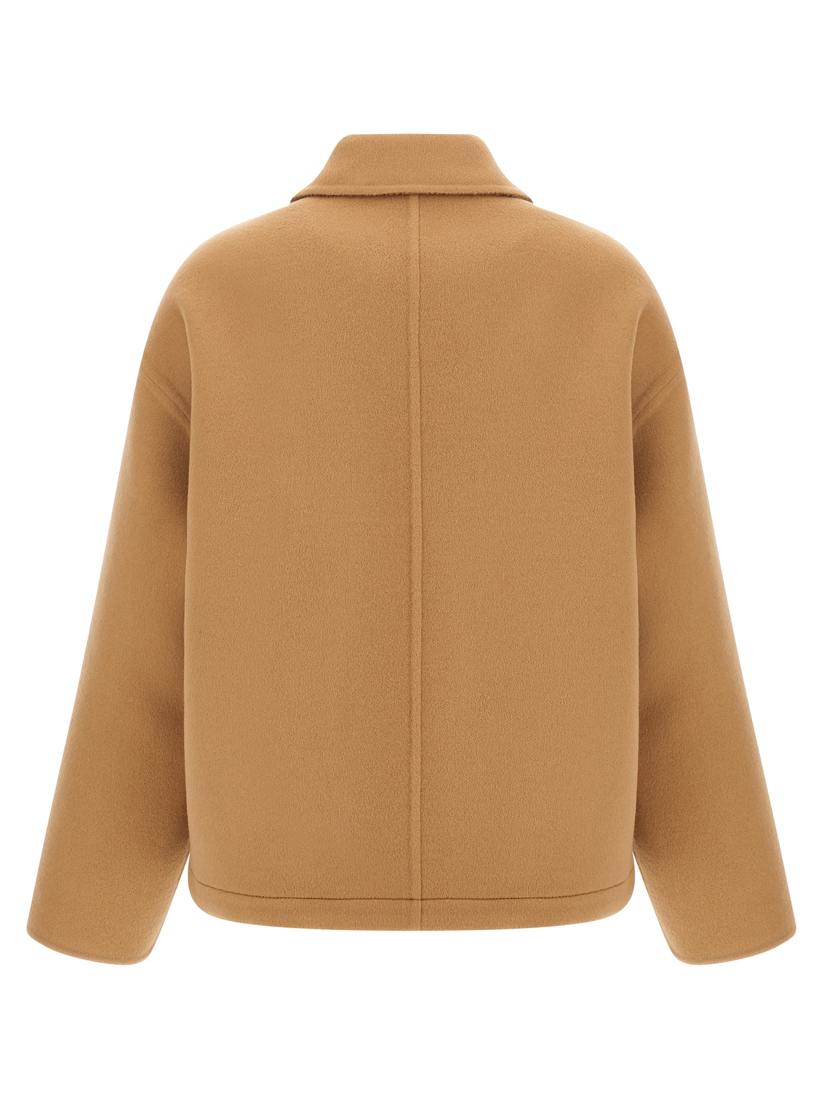 Коротке пальто з вовни та шовку, підкладка з монограмою GG, модель кабан, комір сорочки, застібка-блискавка спереду, кишені, довгі рукави з опущеними плечима, шнурок на подолі.