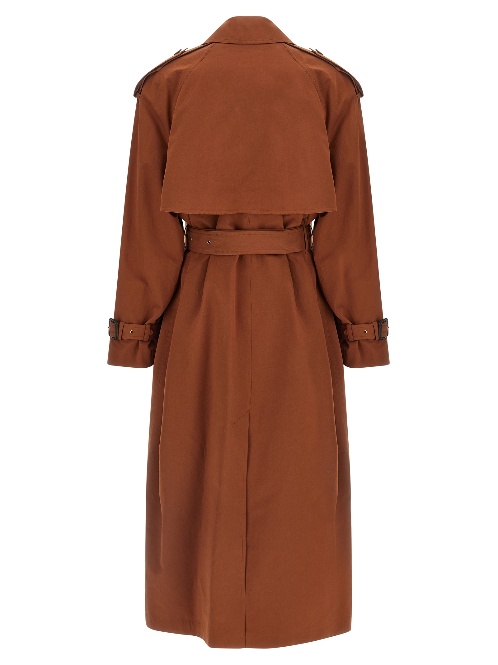 Double-breasted water-repellent cotton trench coat with front horn button closure, triple Ulster collar and adjustable chinstrap, pockets, badge shoulder, long sleeves with adjustable strap at the cuffs, cape and back split, silk lining, removable matching belt.