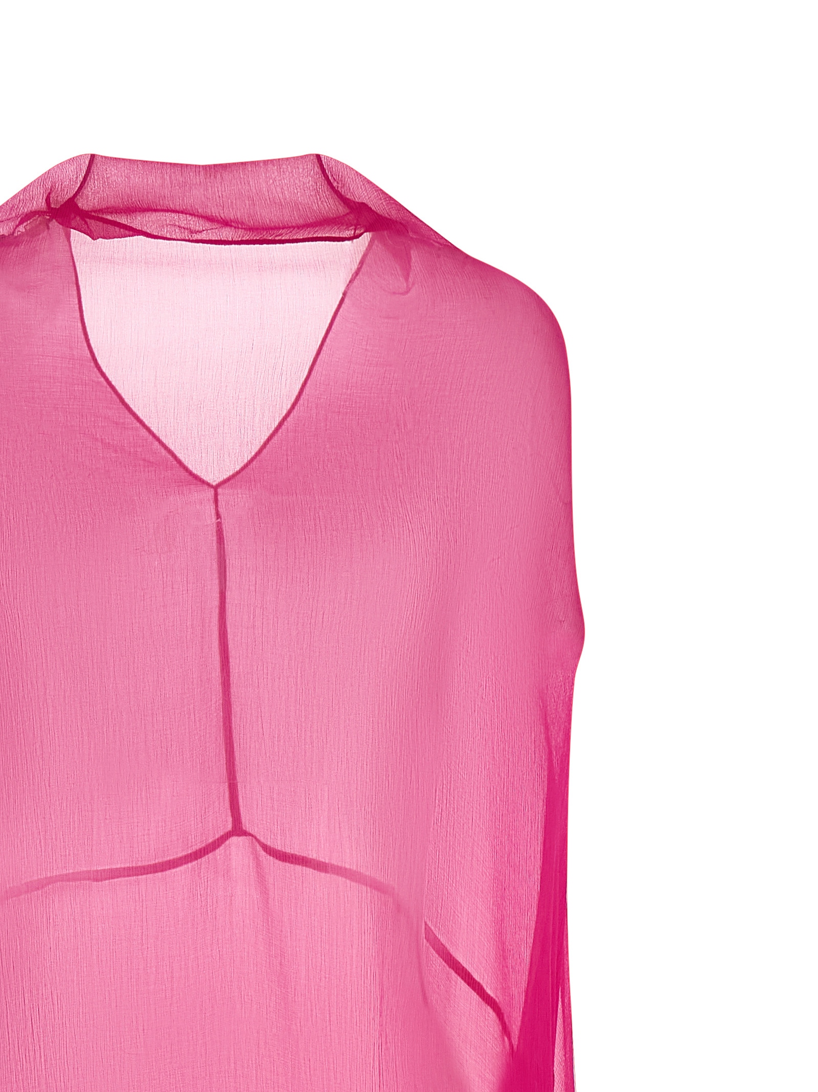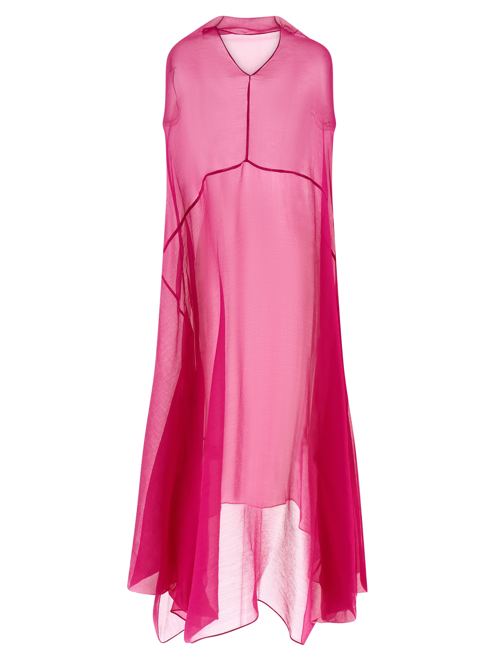 'Ducy' midi dress in semi-transparent silk with crisp hand, neckline with front draping, sleeveless with dropped shoulder, asymmetrical hem with the possibility of adjusting the side flaps.