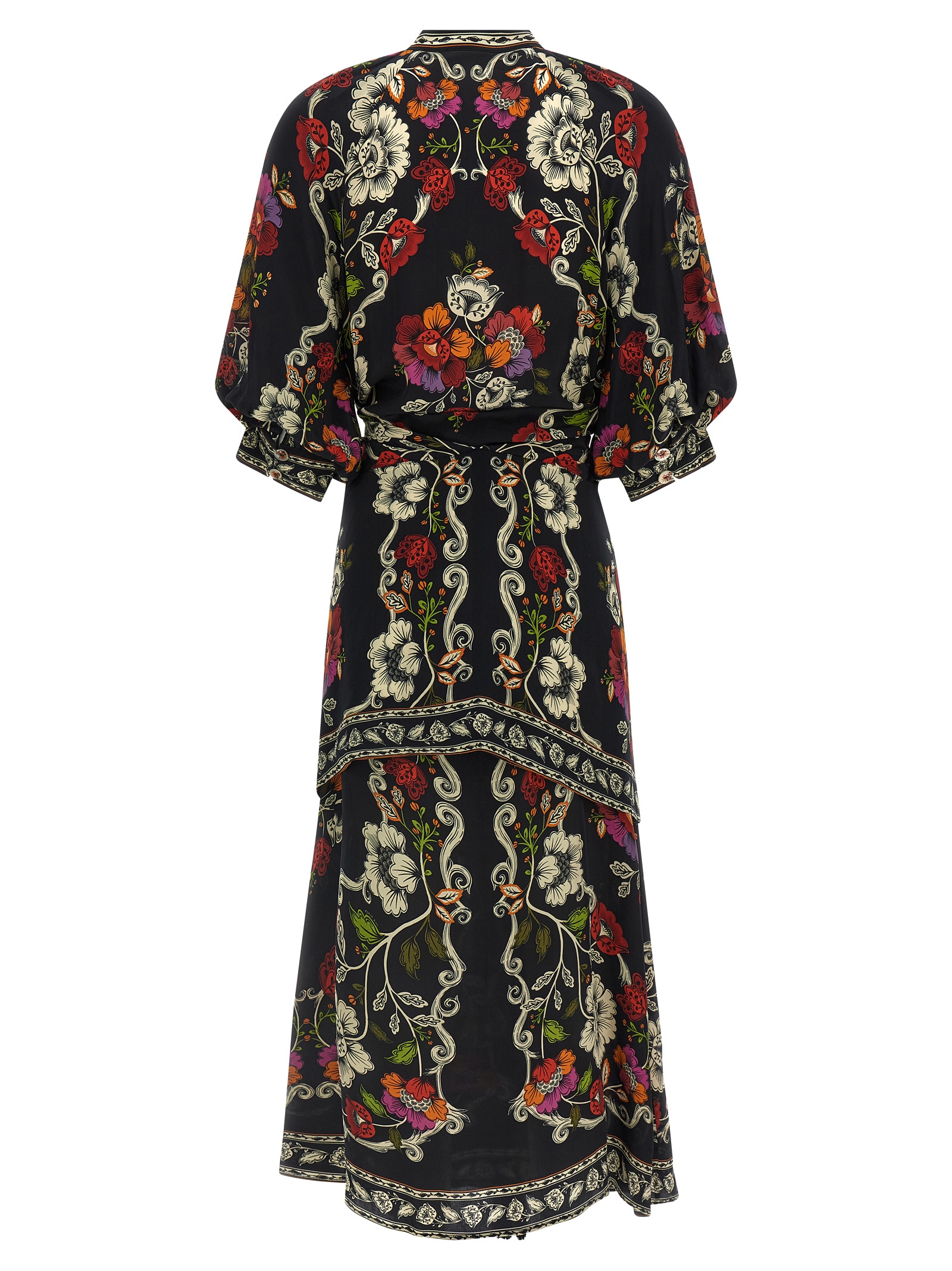 All-over 'Rococò Flowers' print viscose dress, crew neck, concealed front button closure, tone-on-tone pareo with removable tassels to tie at the waist or keep loose like this, 3/4 puff sleeves with cuffs.