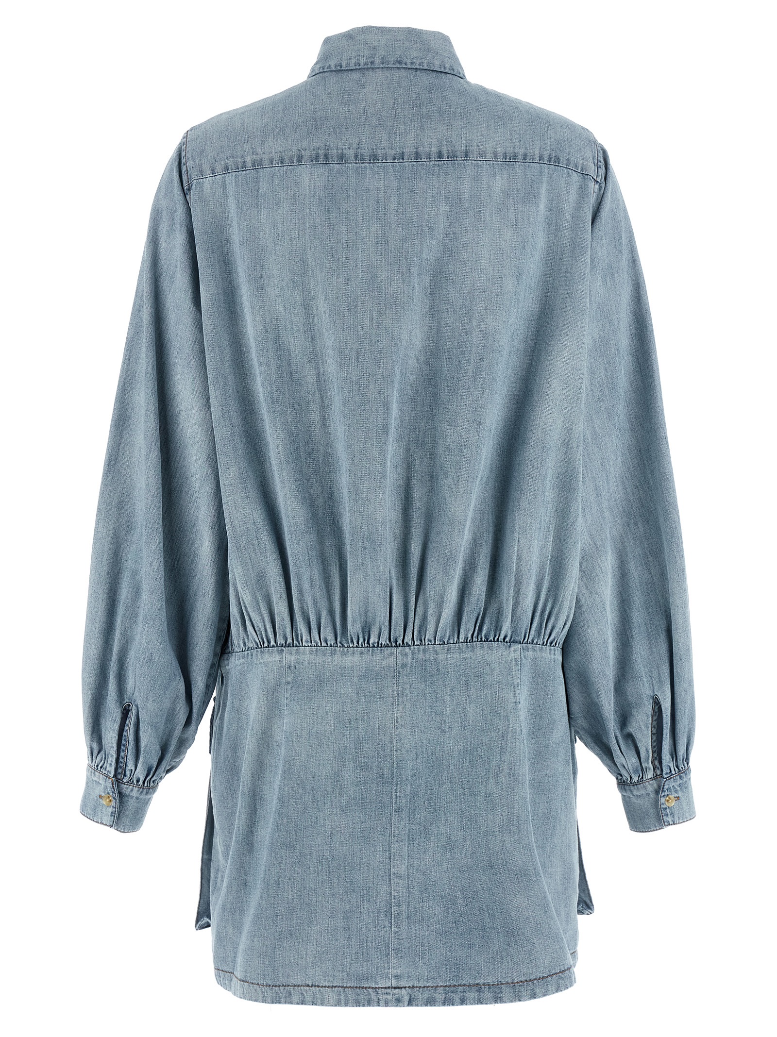 'Utility' cotton denim mini dress with shirt collar, front closure with hidden buttons, front patch pockets, skirt with hidden side zip, long sleeves with cuffs and buttons.