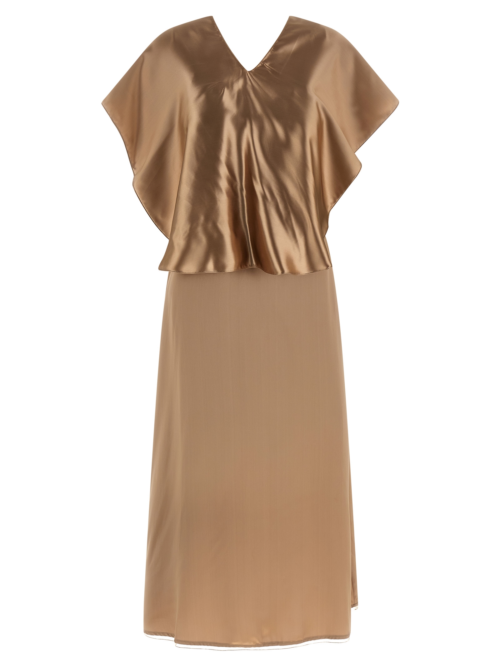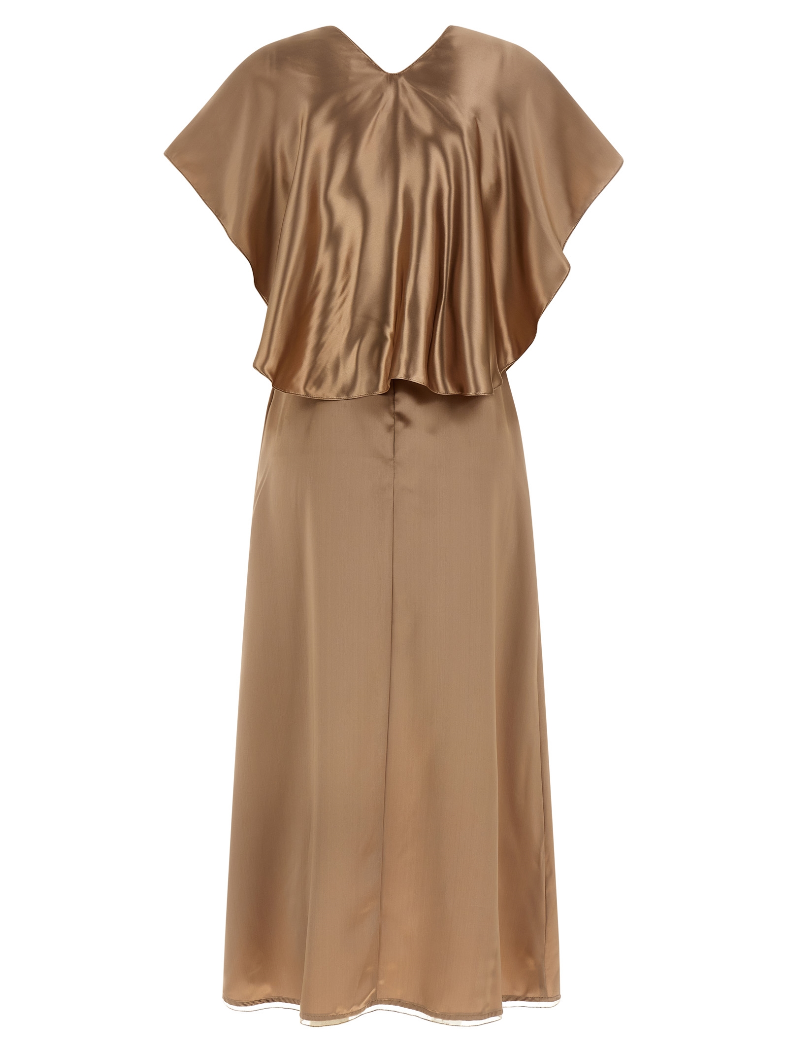 Liquid satin midi dress with lingerie, sweetheart neckline, thin straps, hourglass silhouette, back zip closure, matching cape with boat neckline and removable 3/4 wide sleeves.