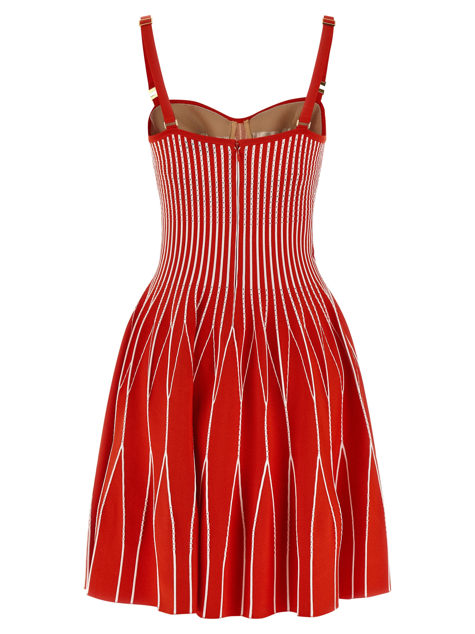 Two-tone knit mini dress, perforated fabric stitch that opens with pleats on the skirt, round neckline with slightly padded corset, thin and adjustable shoulder straps with front enameled metal logo application, back closure with hidden zip.
