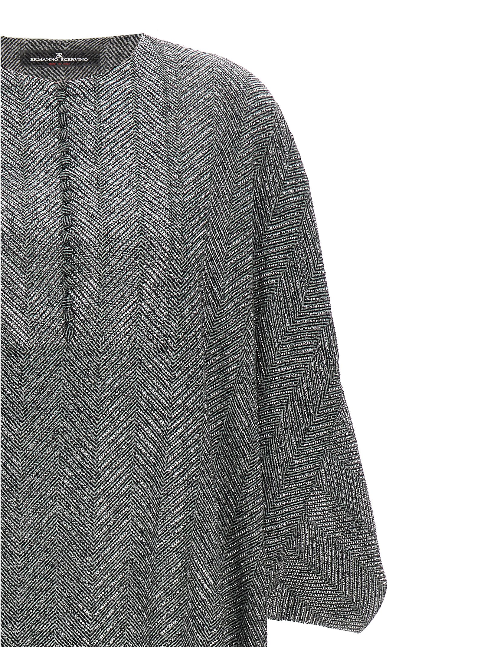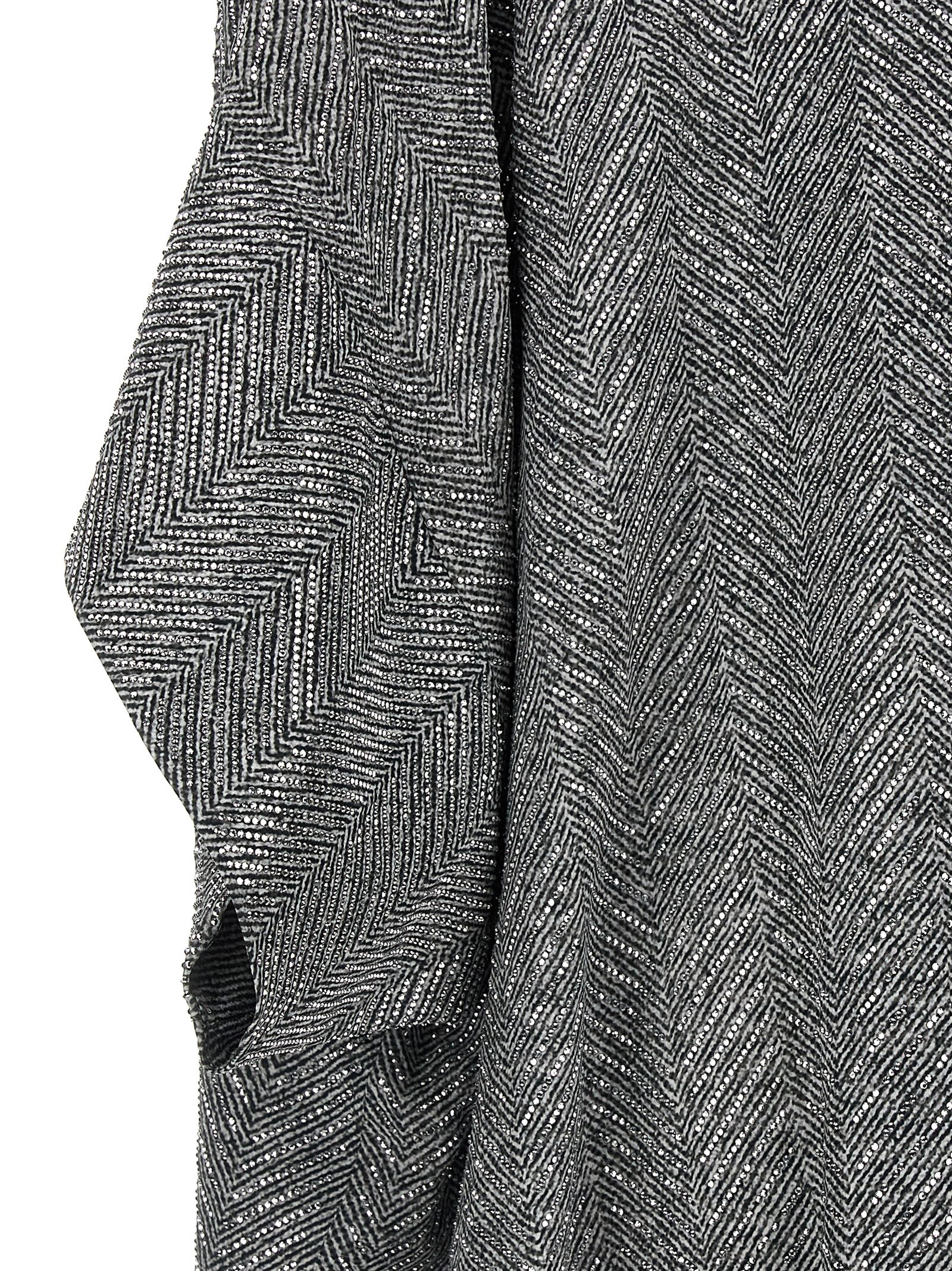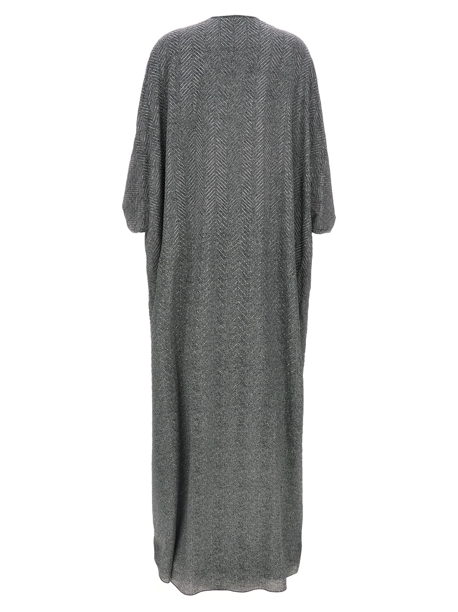 Довга шовкова сукня з візерунком «ялинка» з аплікацією зі стразів по всій поверхні, фасон туніка, круглий виріз горловини, застібка на ґудзиках спереду, рукави-крила, нижня спідниця.
