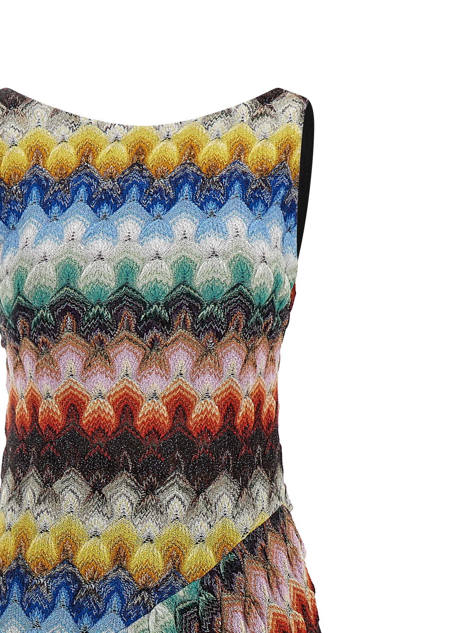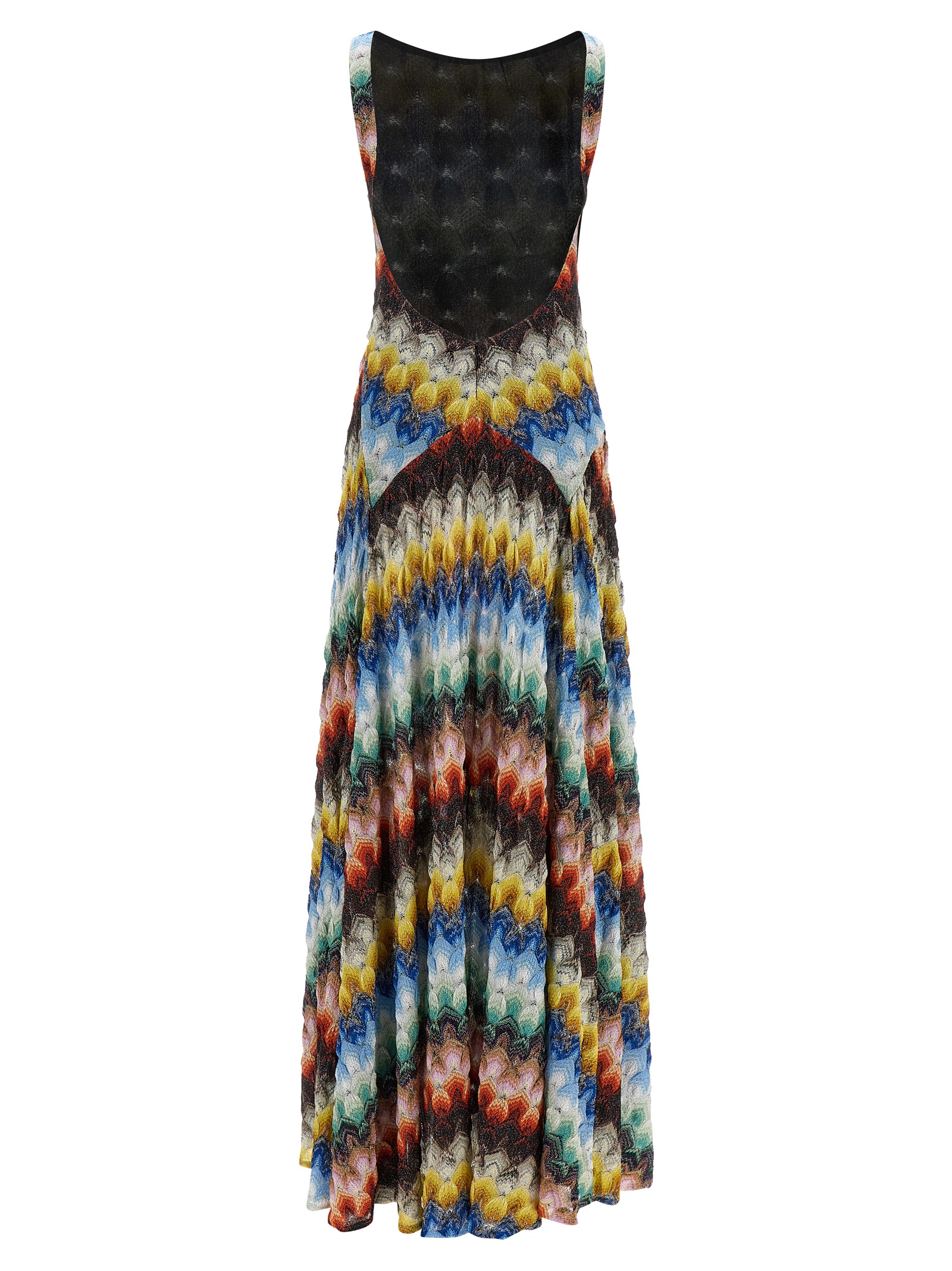 Sleeveless long dress, 'raschel' knit lace pattern, deep back neckline, shoulder straps, cut at the waist, slightly flared at the bottom.