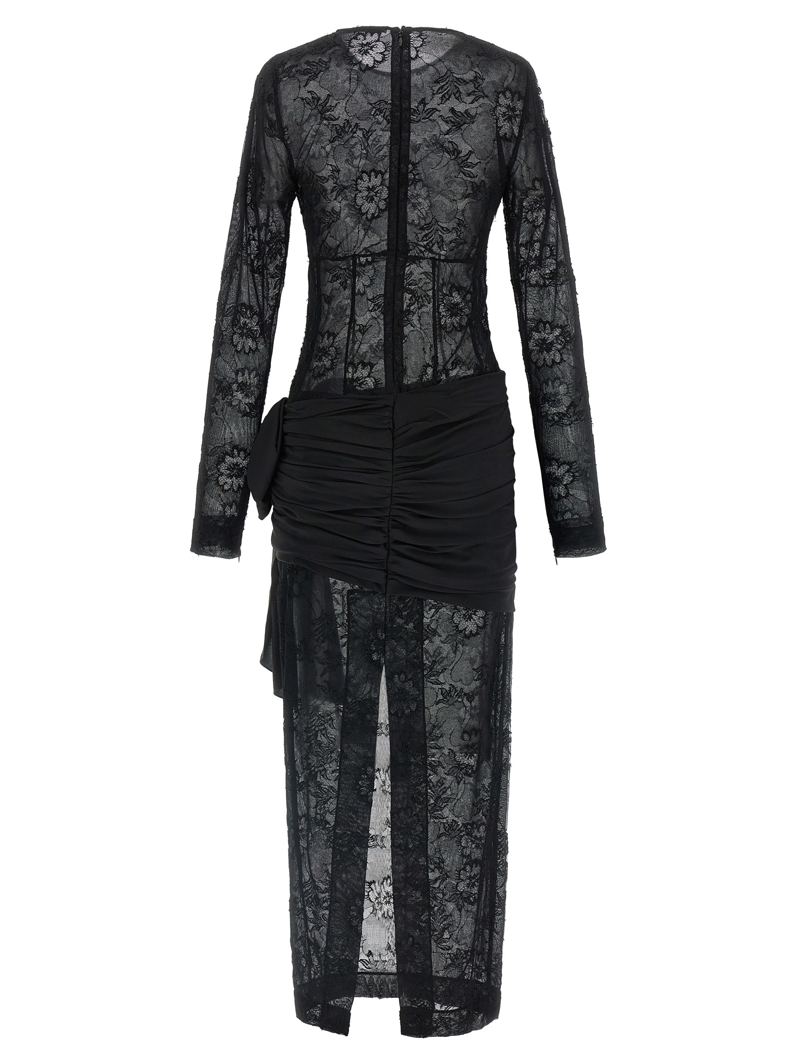 Long semi-transparent lace dress, tone-on-tone silk insert at the waist with curls, draping and maxi bow, round neckline, long sleeves with zip on the hem, zip closure and wide back split.