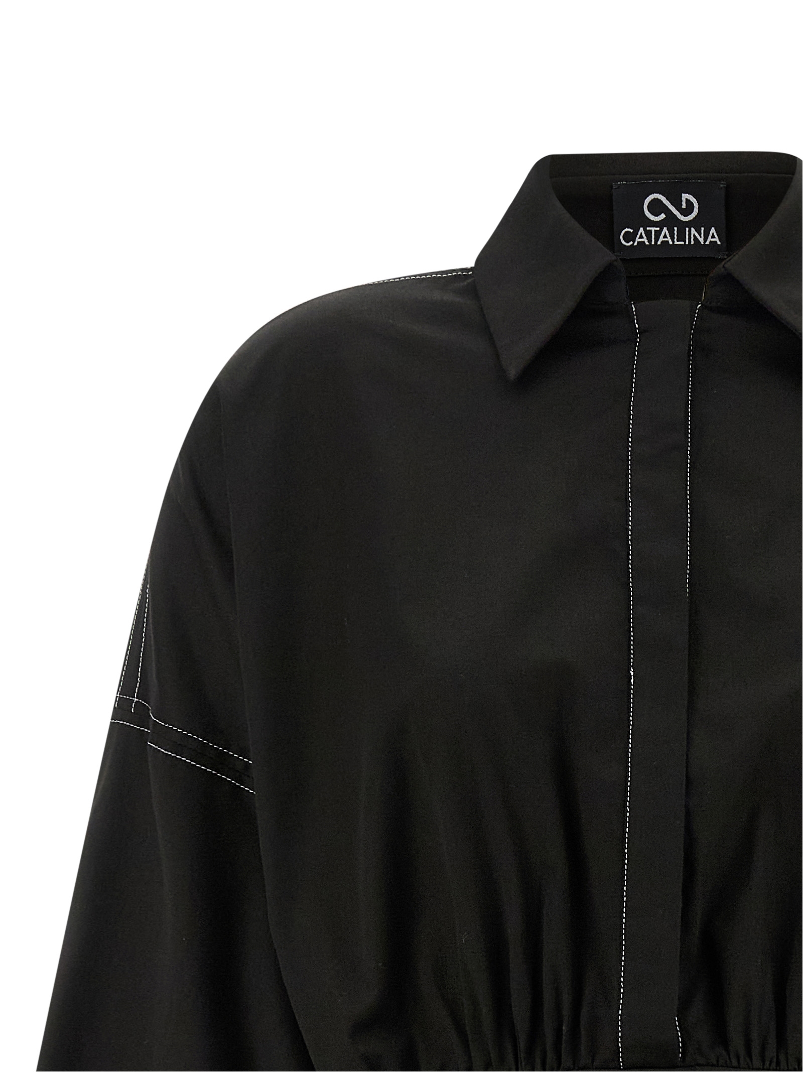 Stretch cotton mini dress with contrast stitching, oversized chemisier top, concealed front button closure, long wide sleeves with cuffs and dropped shoulder, skirt with side inserts to tie into a front bow, side zip closure.