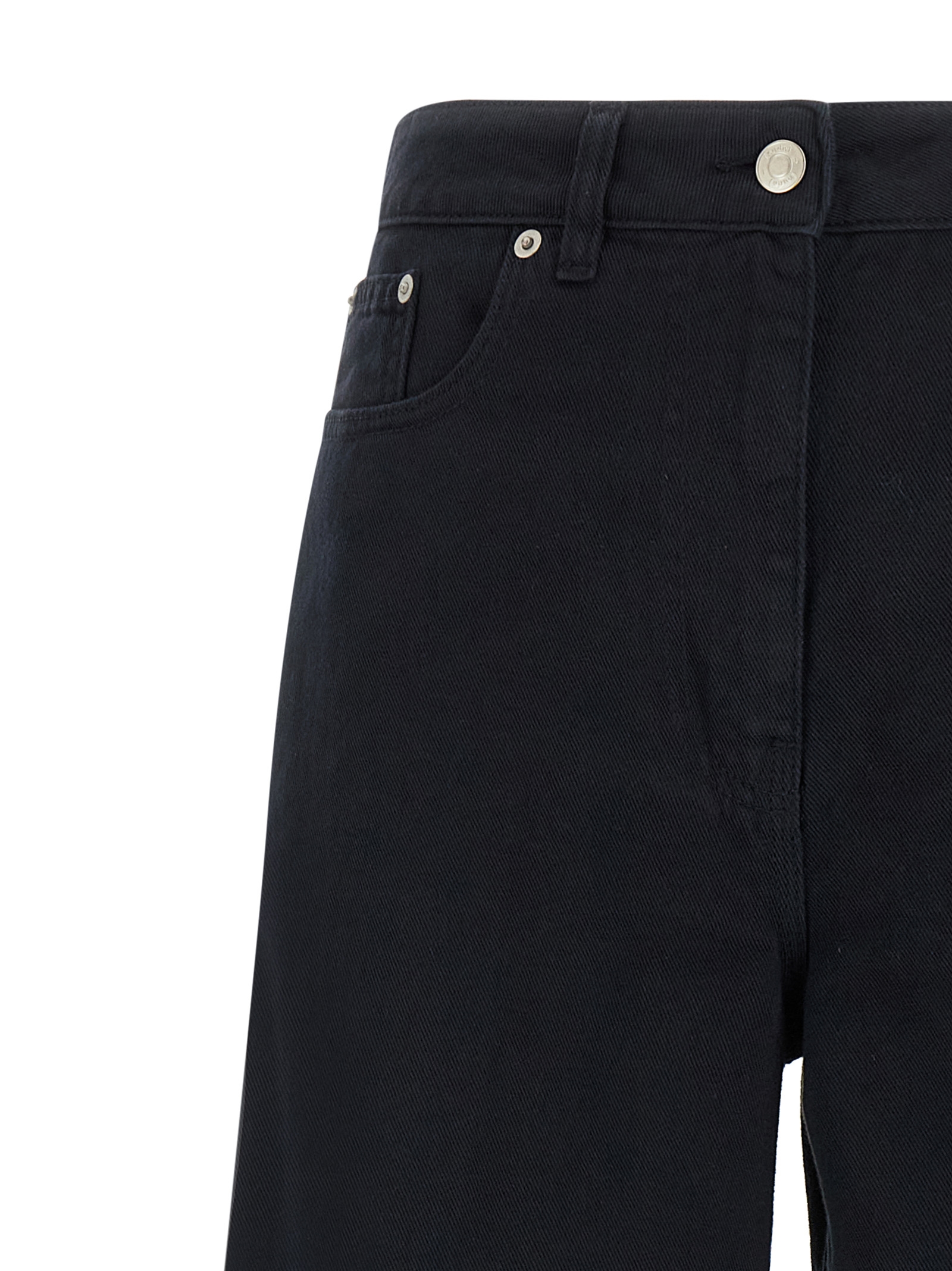 'Tilda' cotton drill trousers, loose and flared leg, medium waist, zip and front button closure, five pockets. Back logo tag.