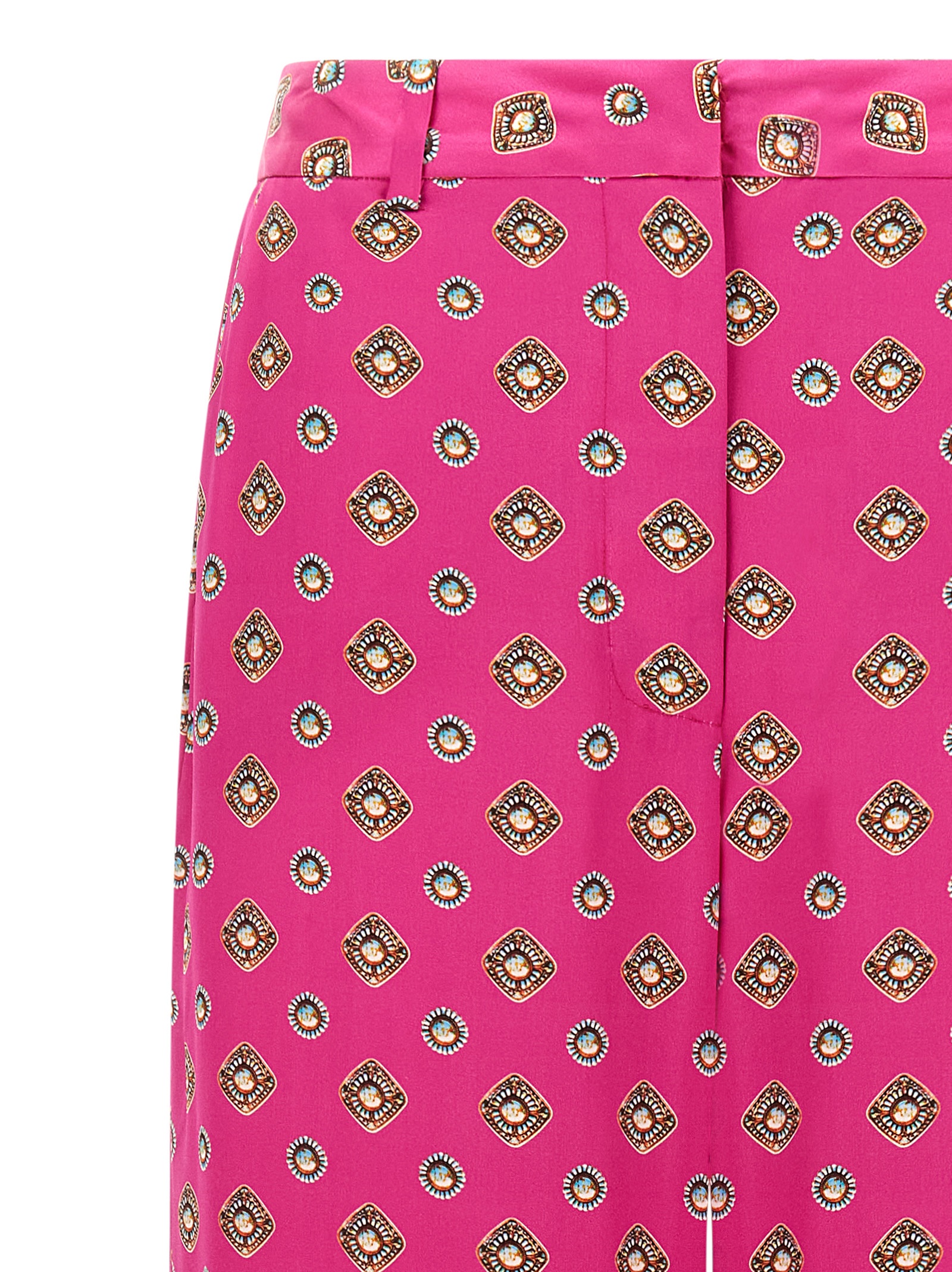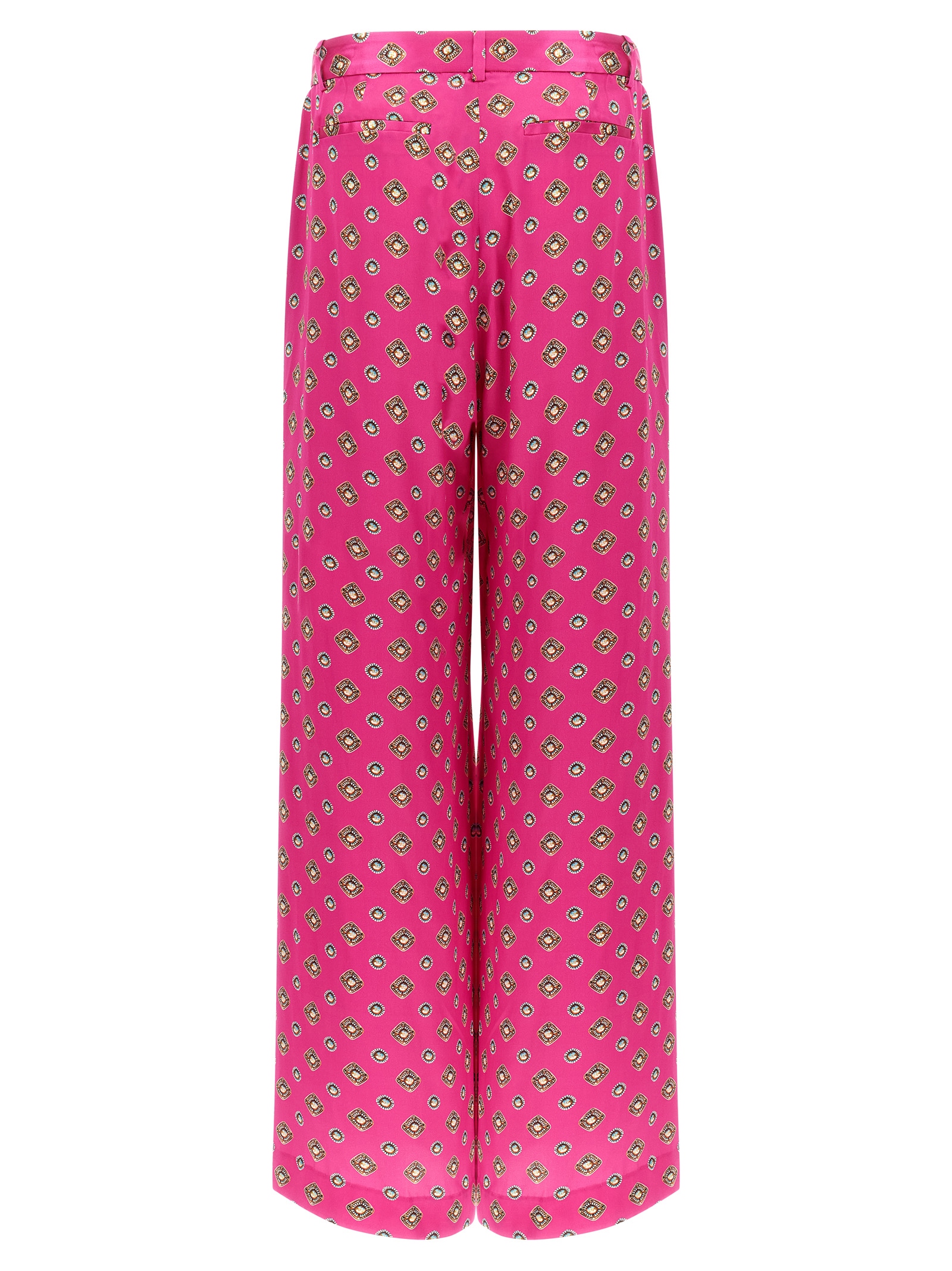Шовкові штани «Pilar» з принтом у стилі південного заходу, розкльошені широкі штанини, висока талія, застібка на гачок і кнопку, кишені.