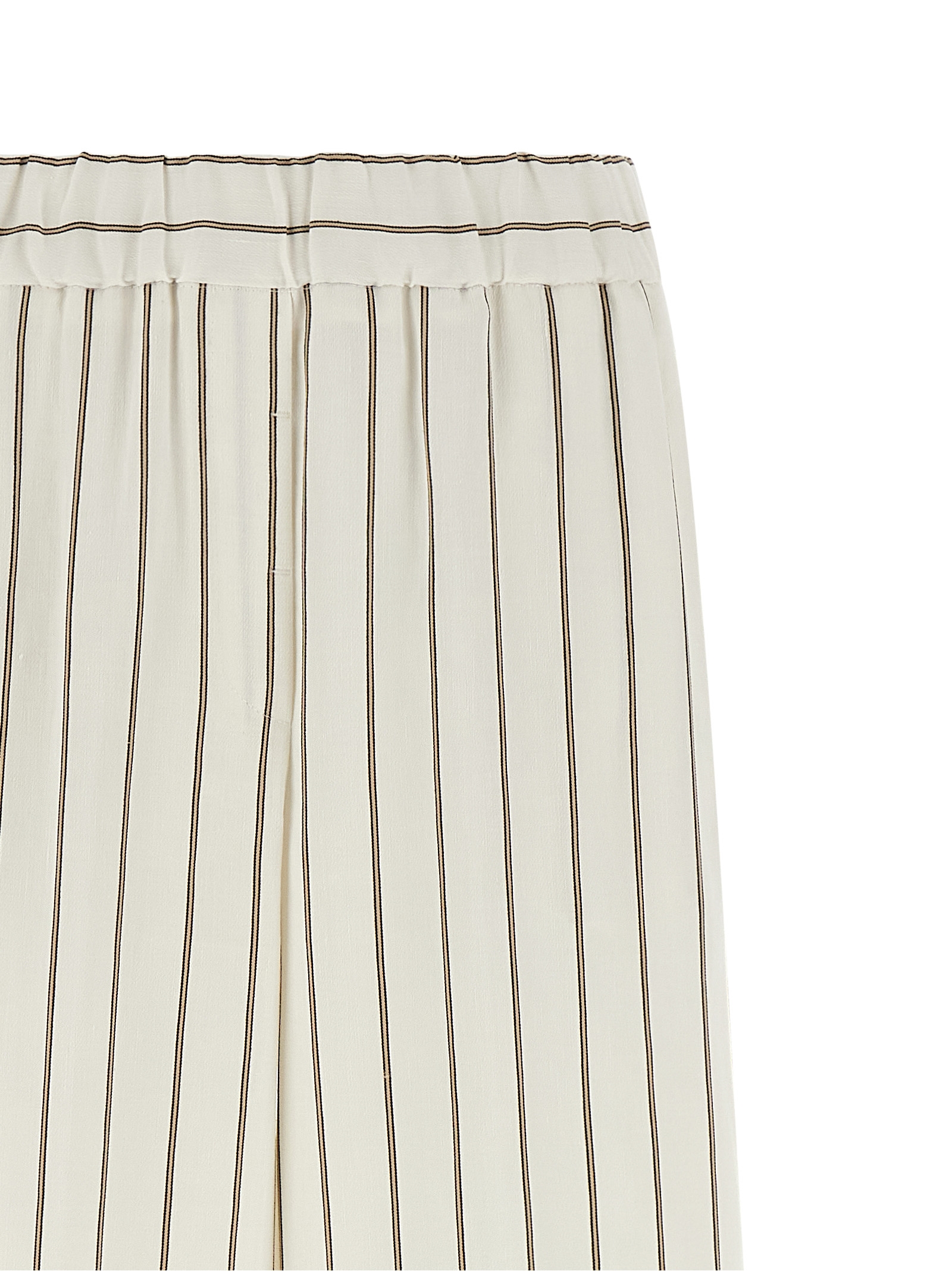 Pinstriped cotton linen twill pants, straight and wide leg, stretched pleat, elastic waistband, trompe l'oeil flap, pockets.
