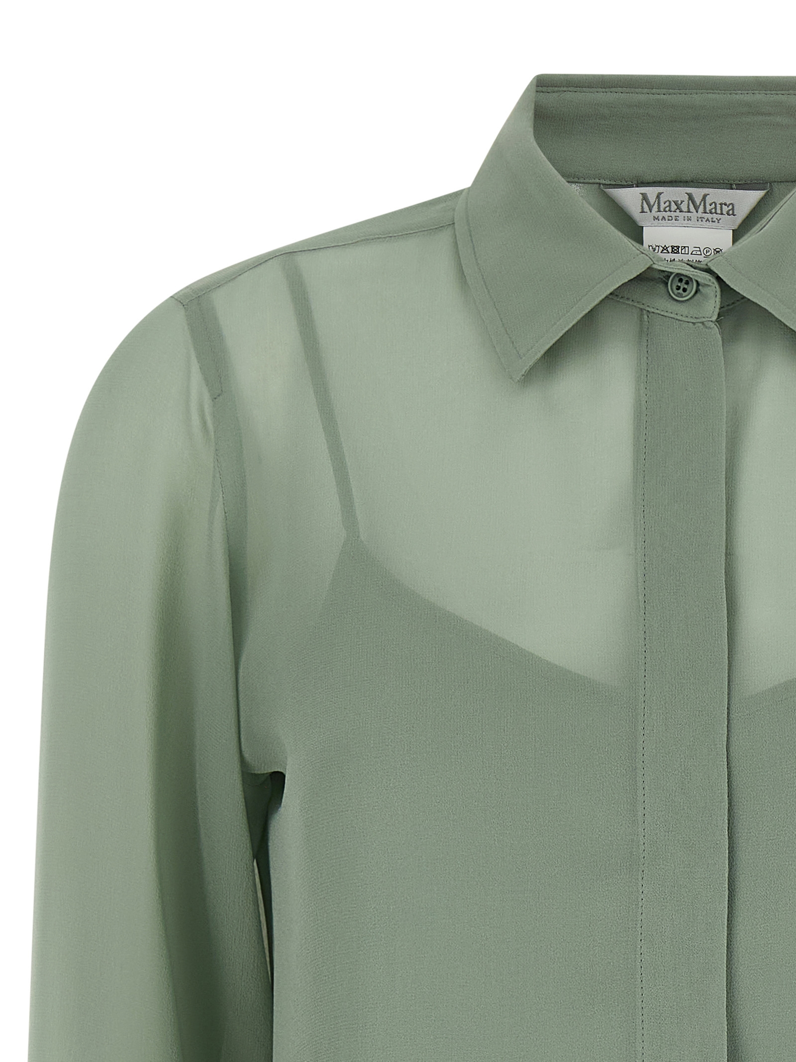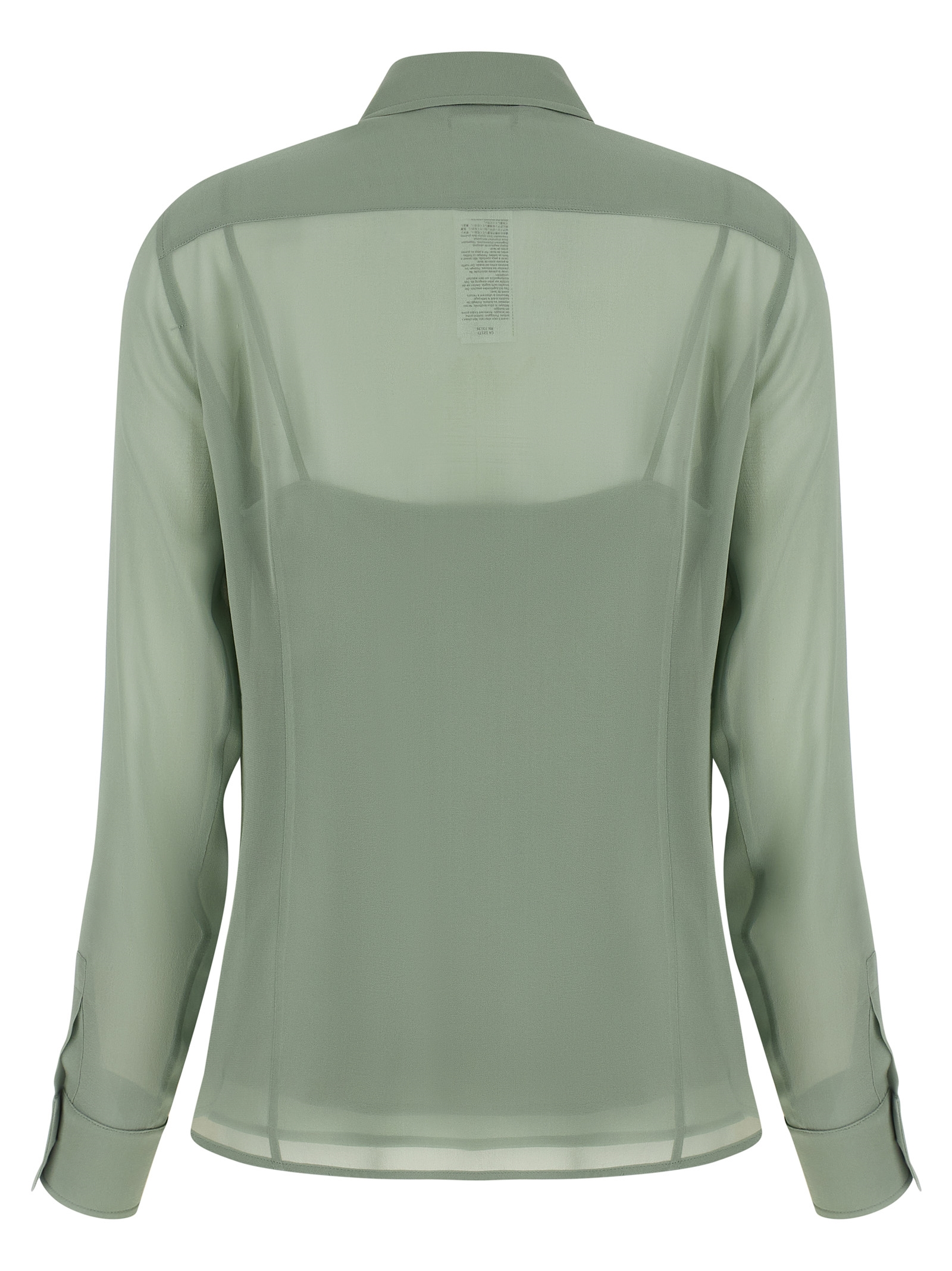 'MxmGolfo' semi-transparent pure silk crêpe de Chine shirt with front button closure, long cuffed sleeves, side slits, rounded hem, removable thin strap top.