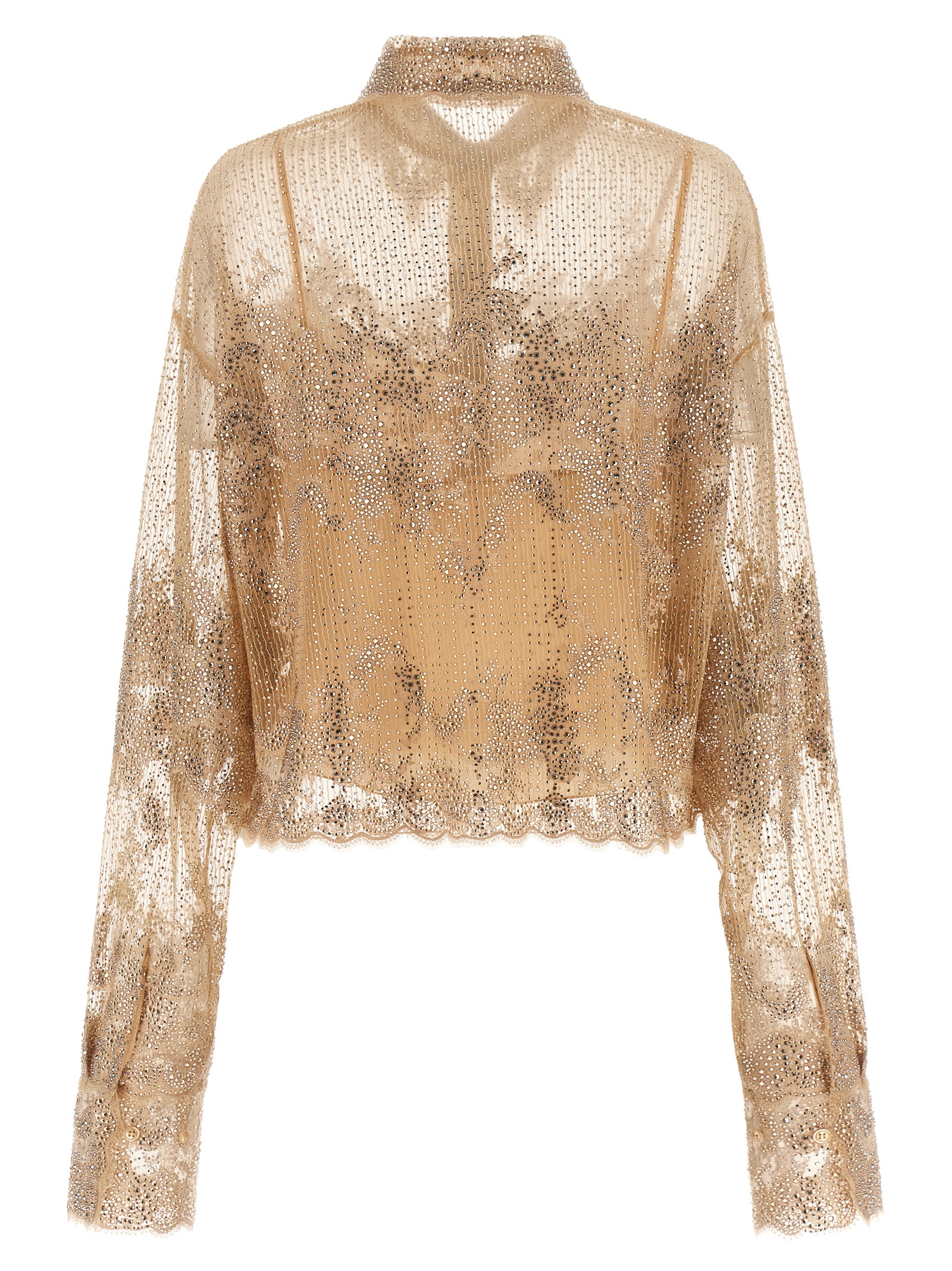 Semi-transparent tulle shirt with all-over crystal application and embroidery detail, tone-on-tone silk chiffon petticoat, detachable with thin straps, classic collar, front closure with hidden buttons, slightly cropped style with lace hem, long sleeves with cuffs.