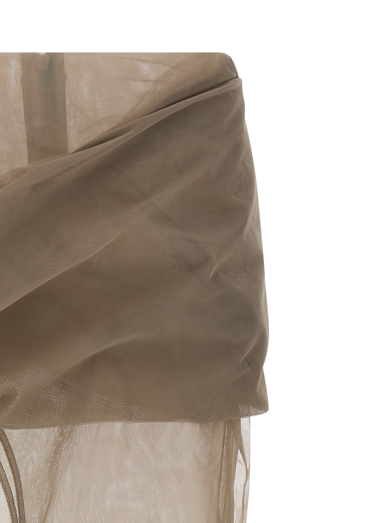 'Draped Calf' midi skirt in double layer tulle, structured design with draping and curling at the front and back, wide front split, back zip closure, asymmetrical hem with raw cut hem.