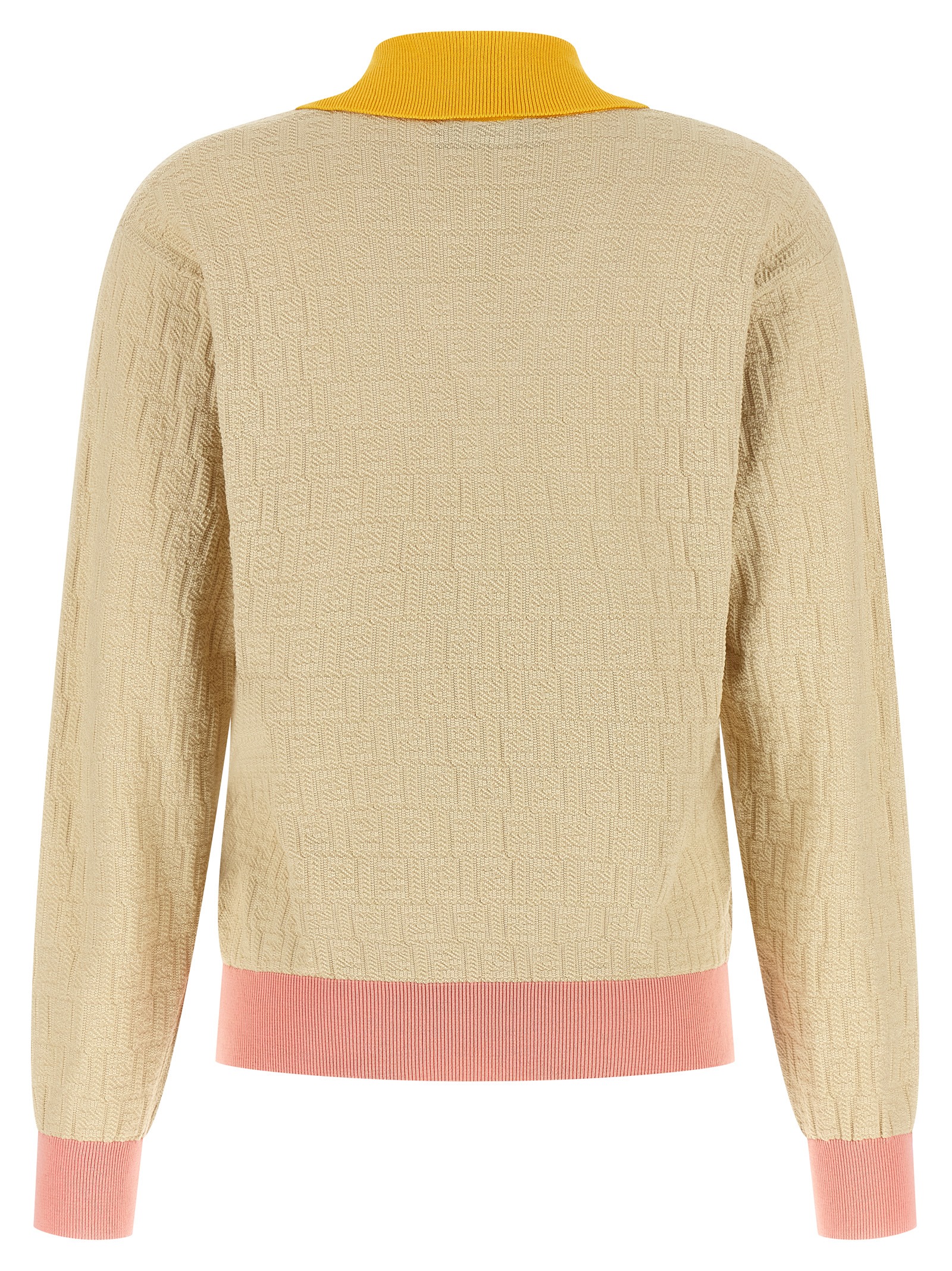 Cotton and silk yarn sweater with iconic all-over jacquard FF pattern, contrast ribbed details, collar, V-neck, long cuffed sleeves, and headband.