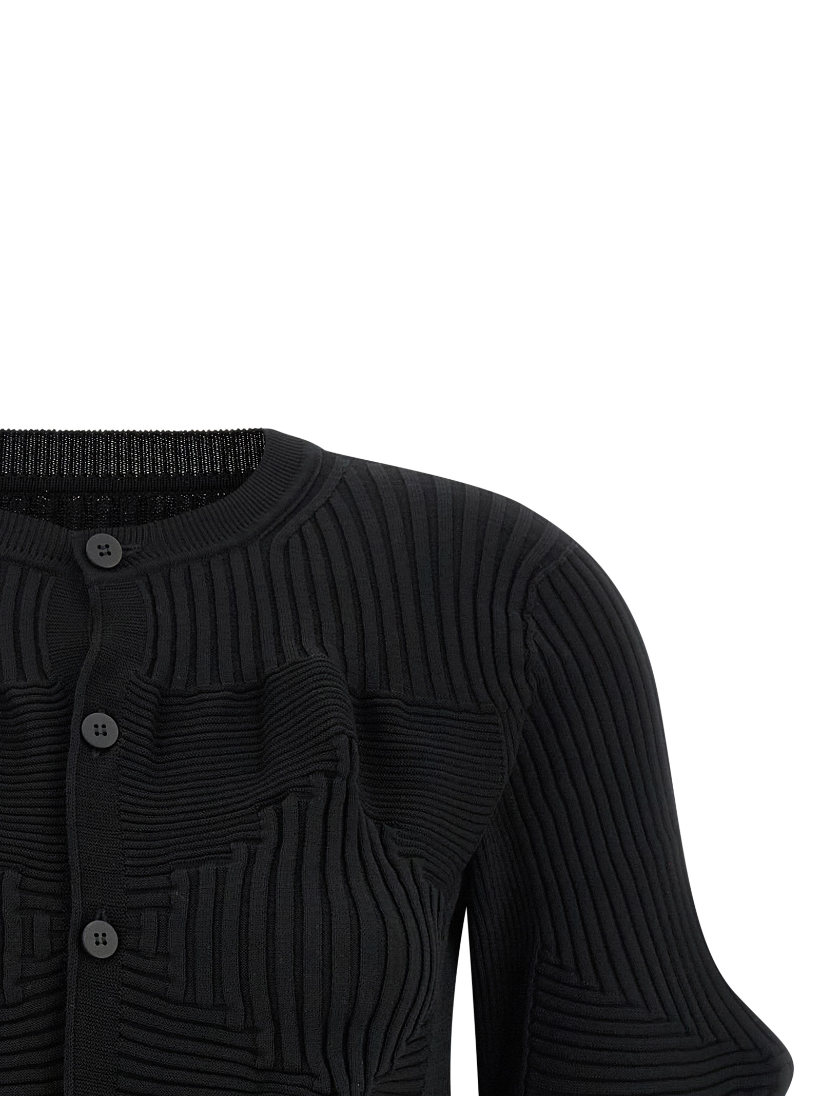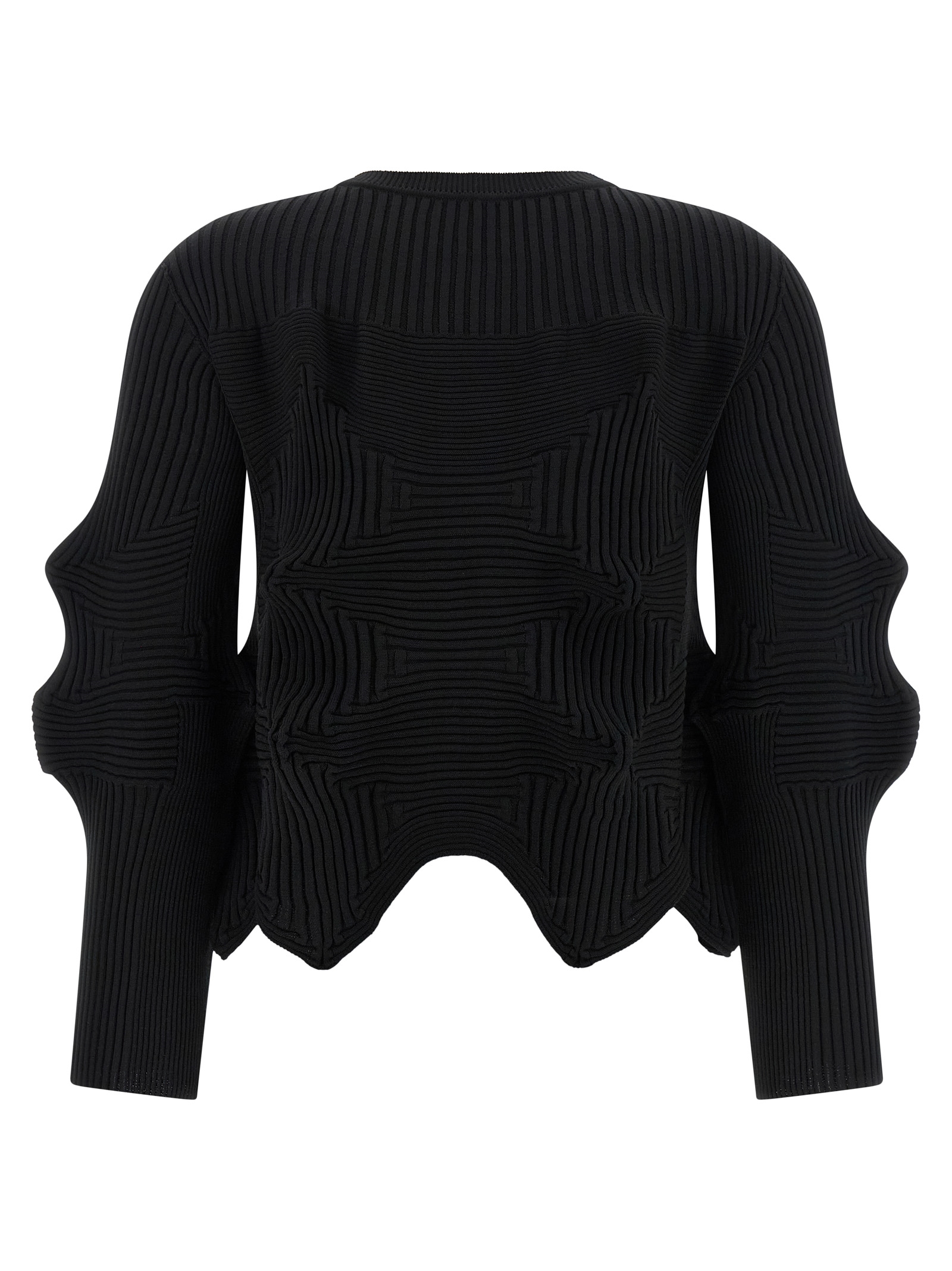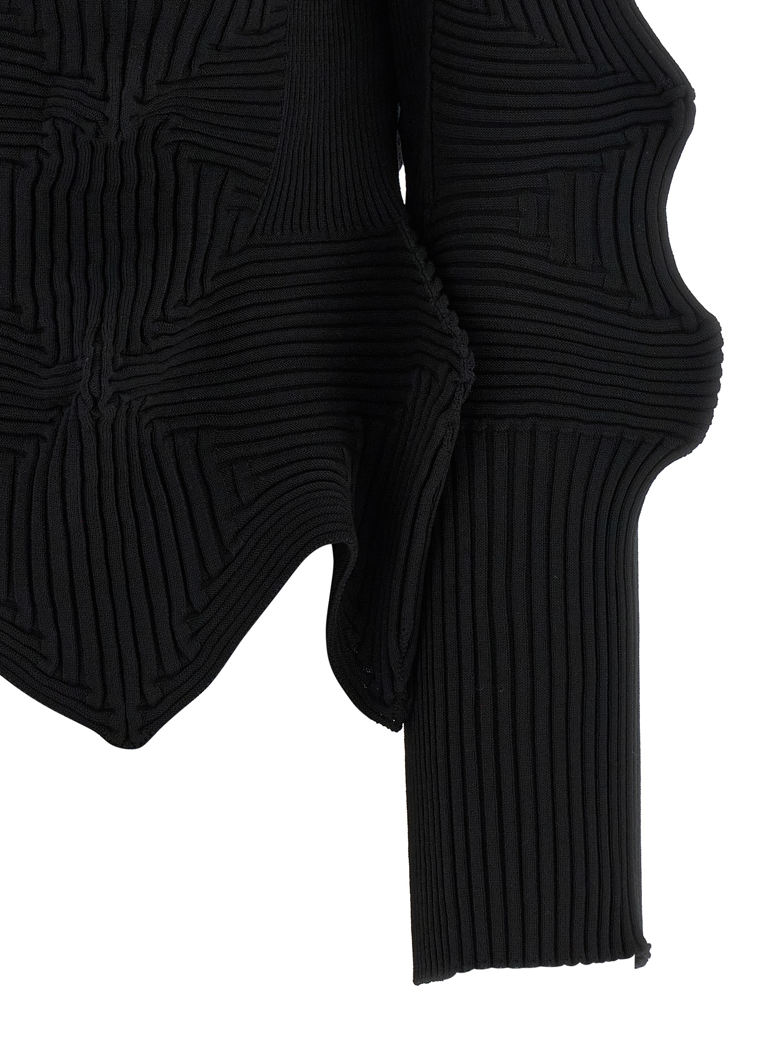 'Linkage' crewneck knit cropped top with elastic ribbed weave structure with asymmetric hem and short sleeves.