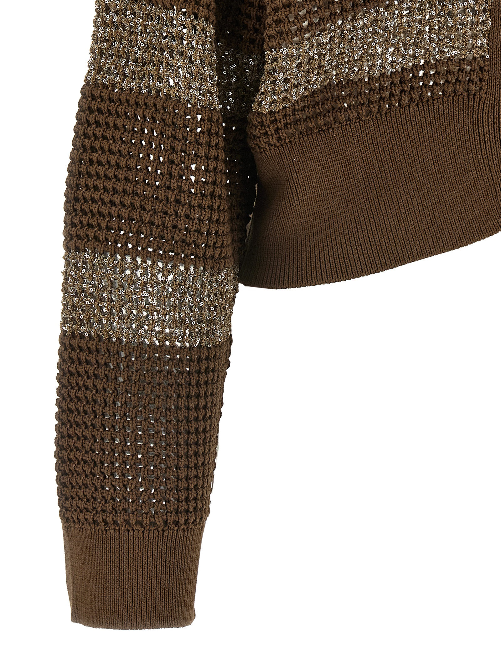 Cotton mesh cardigan with ‘Dazzling Stripes’ micro sequin inserts, cropped style, V-neck, front button closure, long sleeves with cuffs and dropped shoulders, band at the bottom.hem.