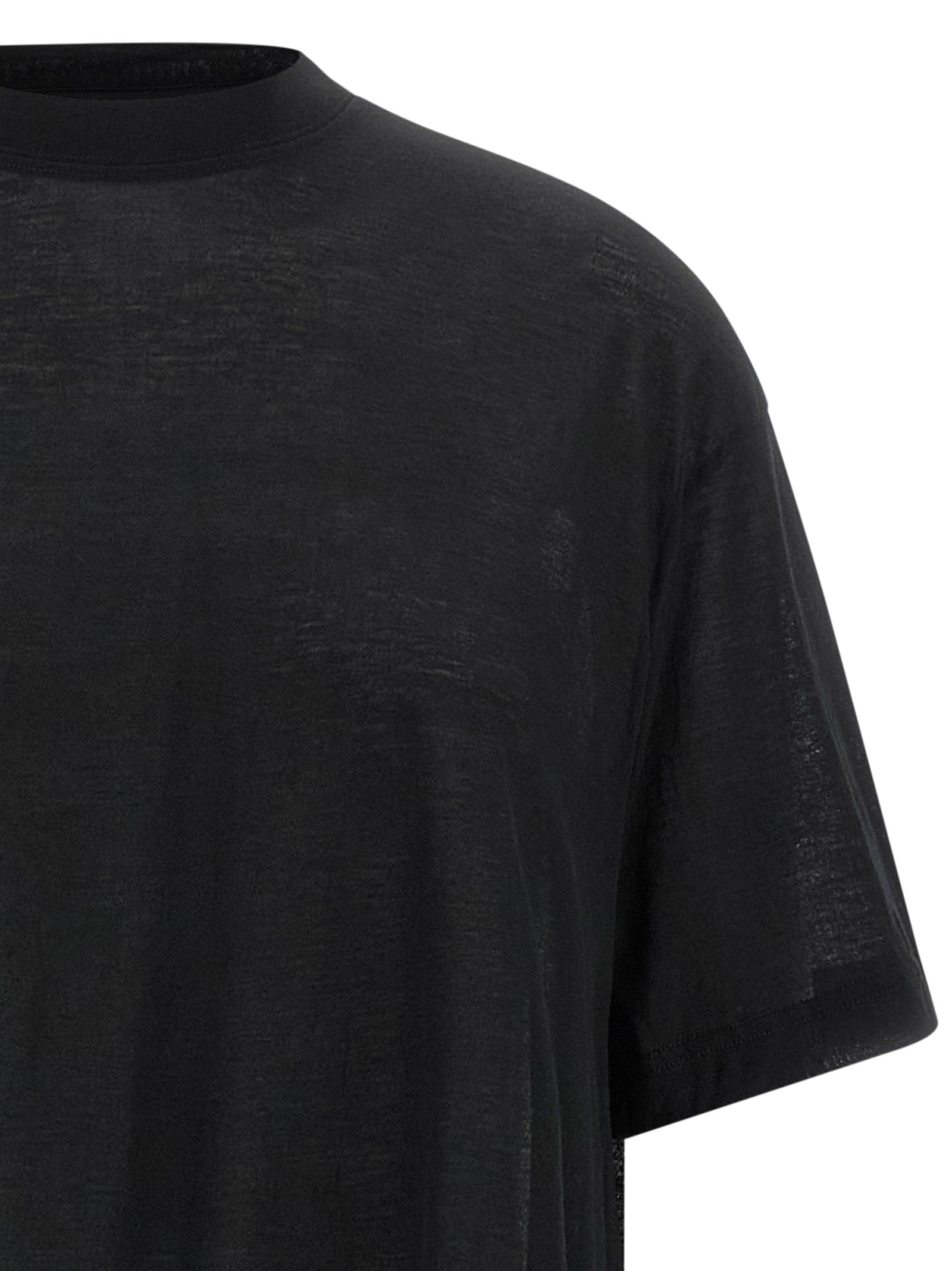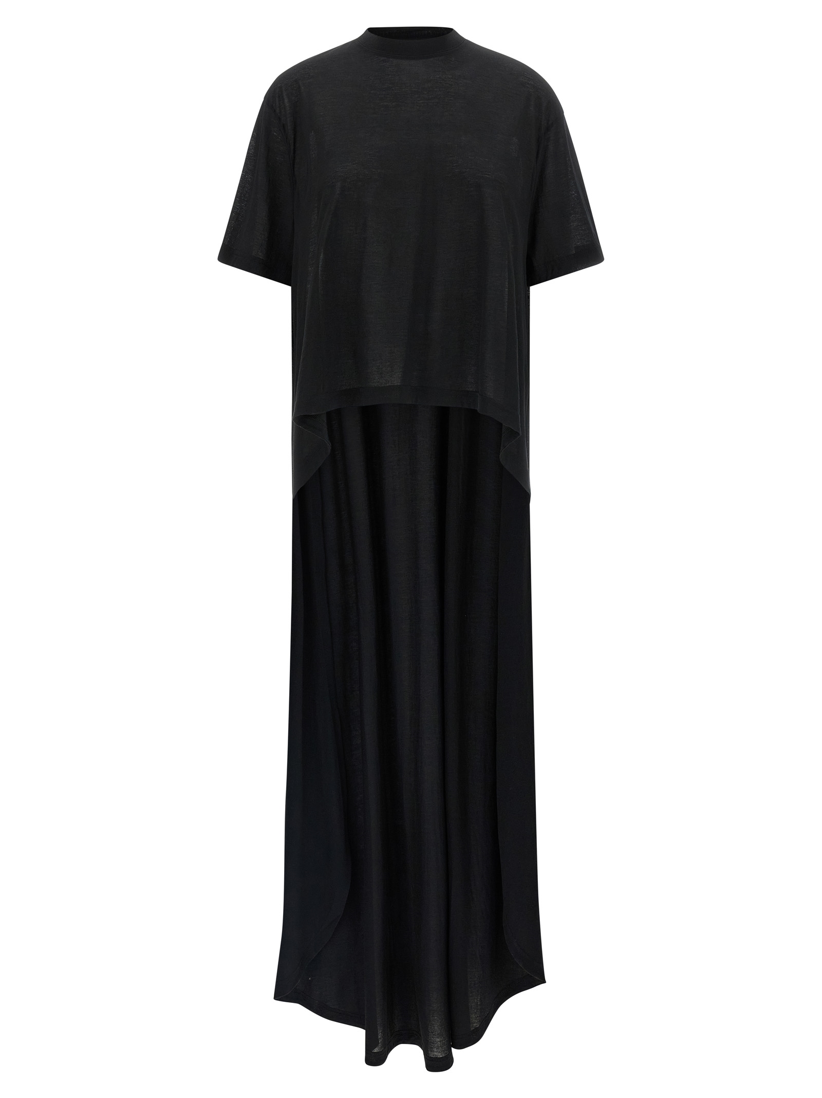 'Short Train' jersey t-shirt of light cotton blend, crew neck, dropped shoulder, short sleeves, asymmetric length.
