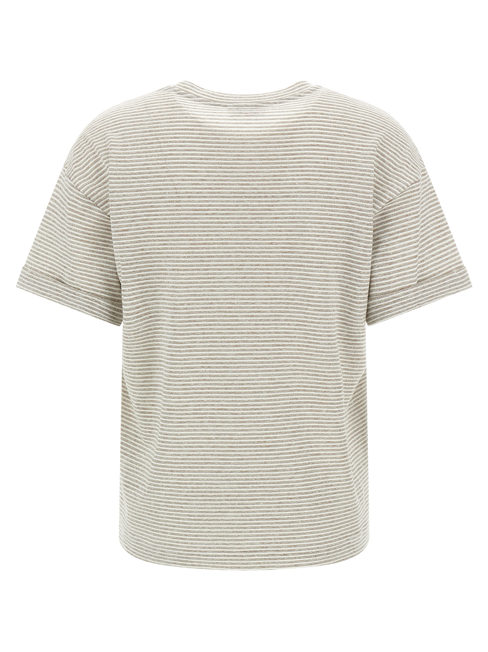 Striped linen and cotton blend T-shirt with lamé thread, crew neck, short sleeves with dropped shoulders and turn-up on the cuffs.