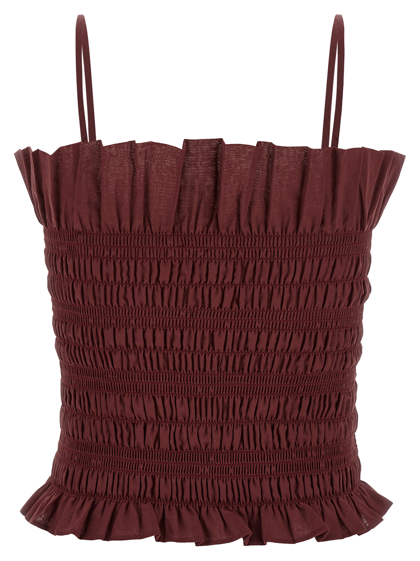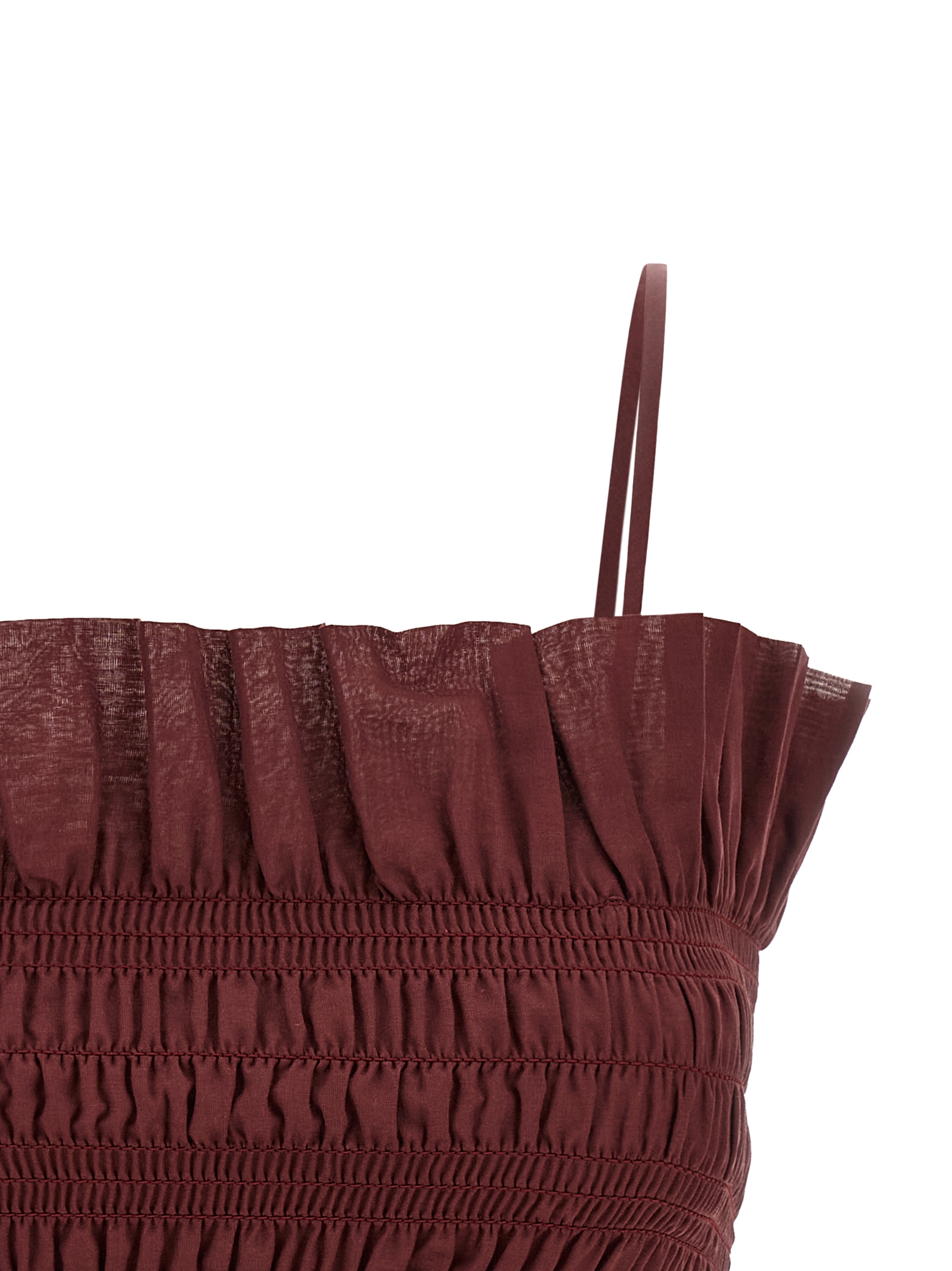 'Suri' tube top in cotton muslin with thin and adjustable straps, smock stitch pattern, curling with flounces on the edges.