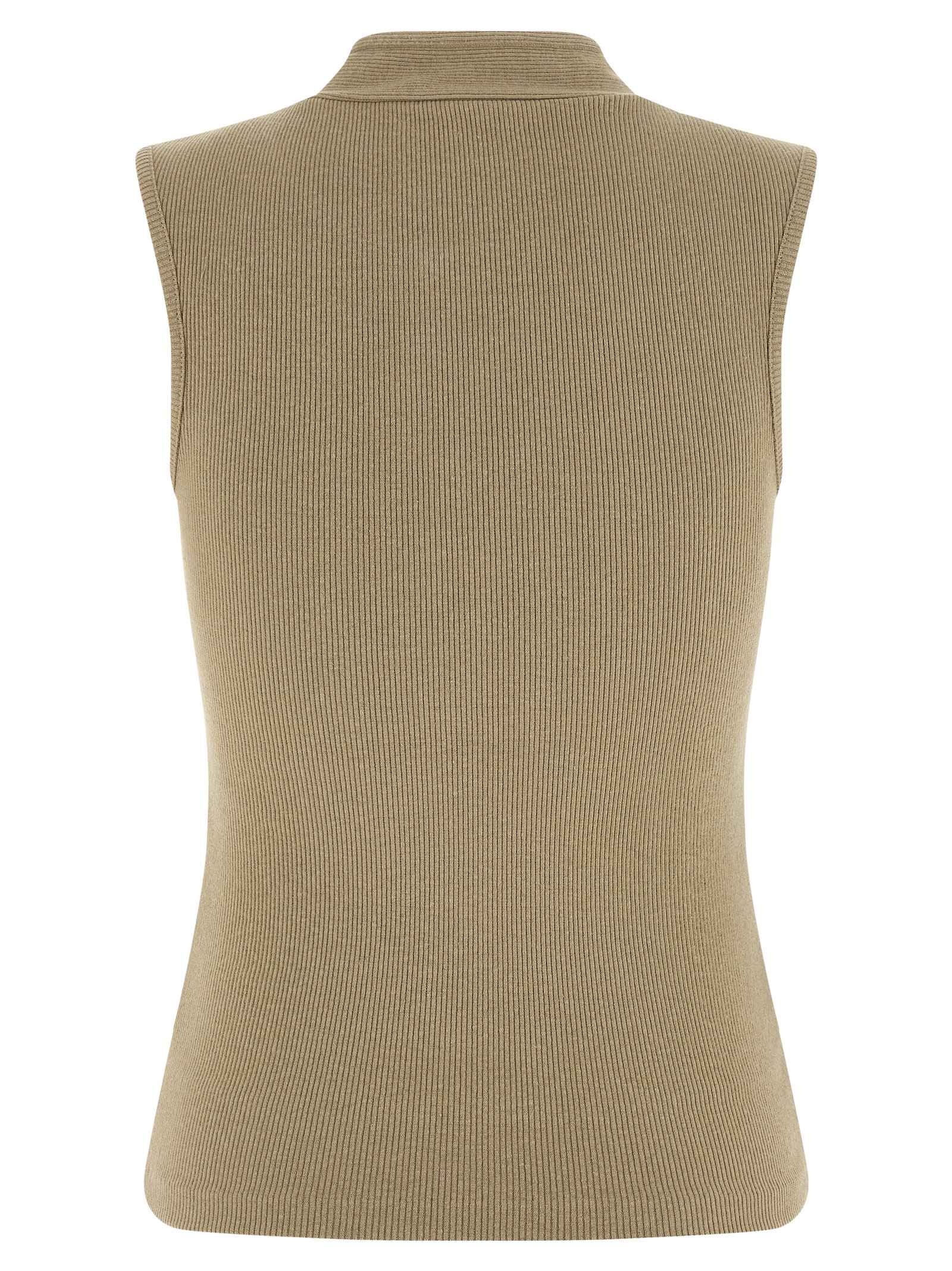'Asymmetrical Fitted' ribbed cotton and linen blend jersey top, double tone-on-tone cotton buttons on the front with mother-of-pearl buttons, crew neck with scarf integrated into the back of the neck.