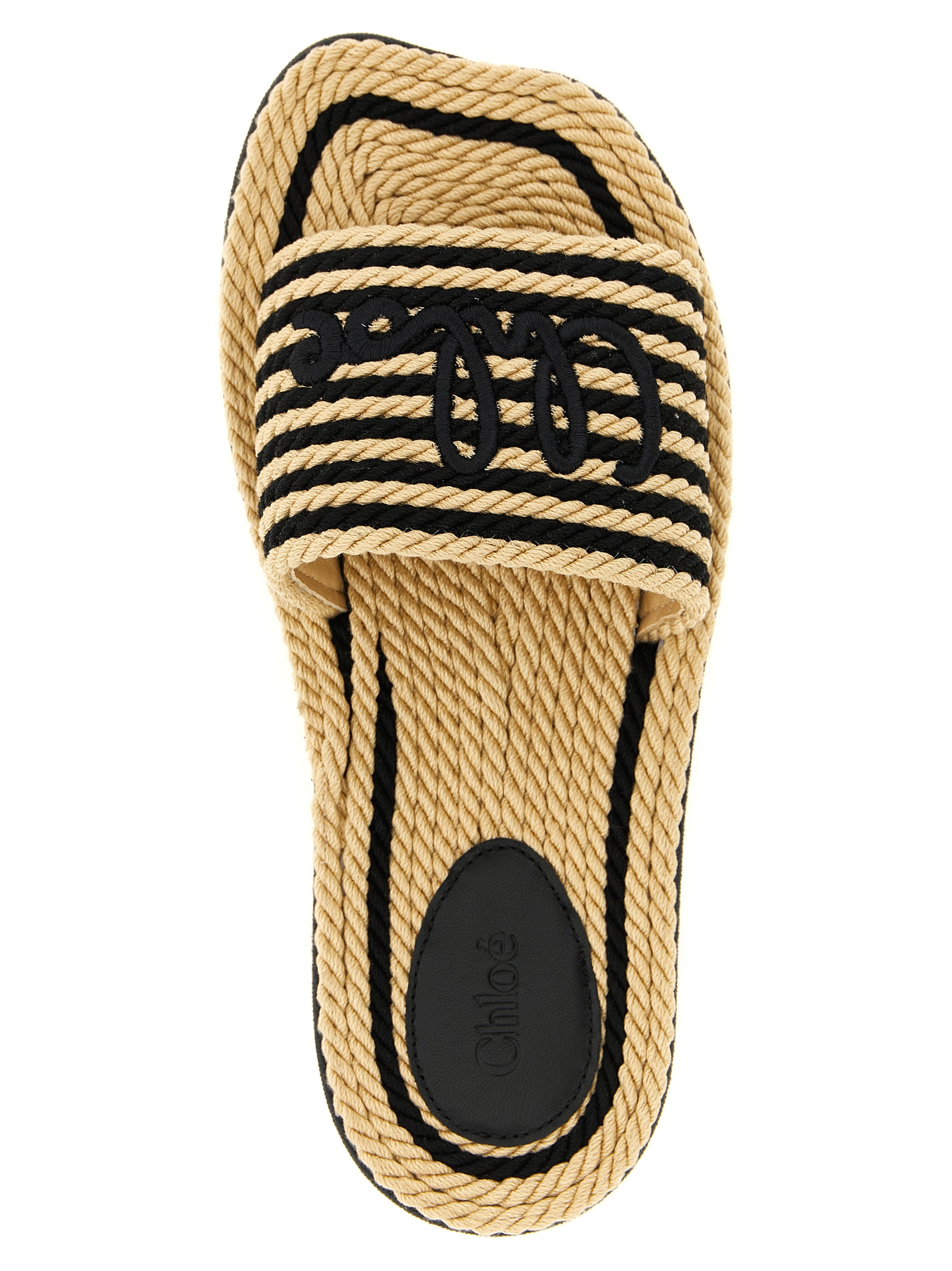 'Chloé Sand' hand-woven two-tone rope sabots, front band with hand-embroidered lettering logo and leather lining, wavy EVA sole.